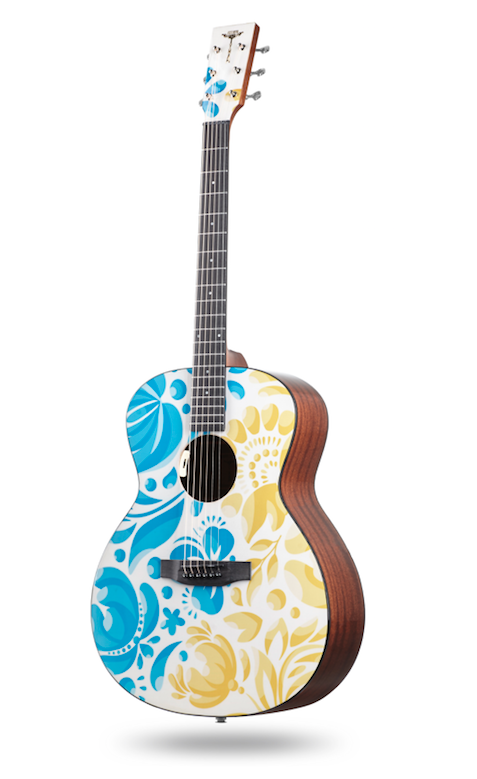 Електроакустична гітара. Форма - гранд аудиторіум. Топ - цільний, ситхінська ялина. Задня дека та боковини - махагон. Гриф - африканський махагон. Брідж та накладка на гриф - штучний ебоні. Фініш - в кольорах українського прапору. Електроніка - TYMA T-50. В комплекті - фірмовий гітарний чохол, ганчірка, ремінь.
