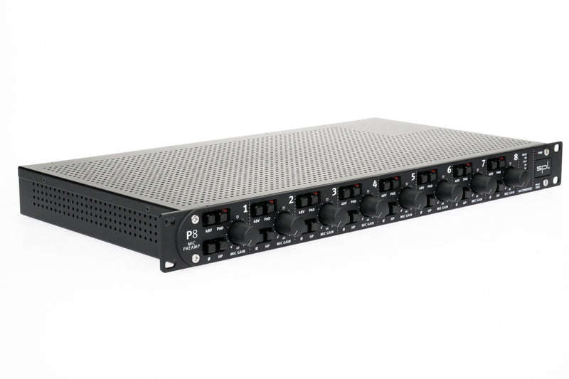 SPL P8 — це восьмиканальний мікрофонний передпідсилювач, Усі вісім попередніх підсилювачів P8 мають дискретну конструкцію, яка використовує окремі транзистори без мікросхем, і обіцяють відкритий і прозорий звук. Доступне підсилення до 62 дБ що дозволяє працювати навіть з дуже вимогливими мікрофонами. Кожен канал оснащений ідентичним набором елементів керування, що включає перемикач фантомного живлення, атенюатор -20 дБ, зміну полярності та HPF-фільтр 6 дБ/октаву, 80 Гц. Роз’єми Neutrik XLR на задній панелі обслуговують усі входи пристрою, а вихід лінійного рівня забезпечується роз’ємом DB25. На задній панелі розташовані входи Neutrik XLR з позолоченими контактами та балансні лінійні виходи через роз’єм DB25. Для розширення можливостей пристрій може бути оснащений додатковою восьмиканальною платою аналого-цифрового перетворювача (ADC8), яка має пару виходів ADAT на роз’ємах Toslink разом із коаксіальним входом/виходом Word Clock. Конвертер використовує мікросхему AKM AK5538 і підтримує частоту дискретизації д