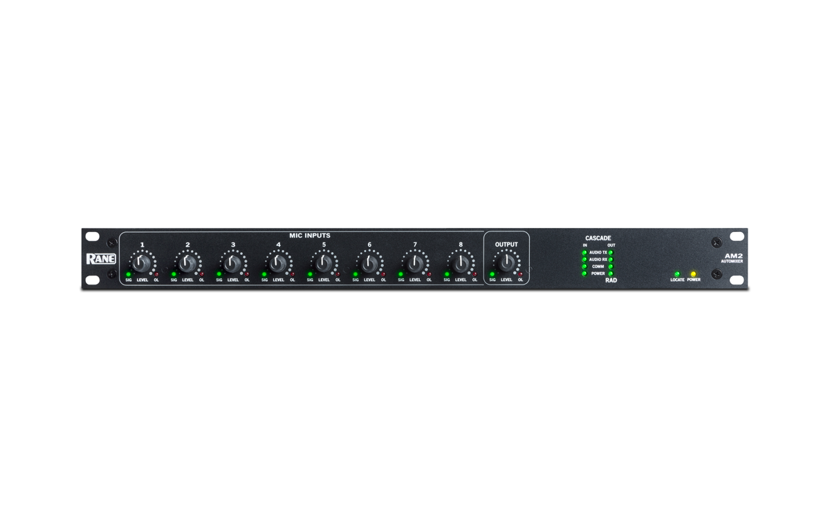 Rane AM2 - це одночасно 8-канальний автоматичний мікшер з розподілом коефіцієнта посилення і одночасно Rane RAD. Використовуйте його як автономний мікшер, призначений лише для мікрофона, додайте більше мікрофонів із розподіленим коефіцієнтом підсилення, використовуючи до семи додаткових AM2 Automixers, та / або використовуйте порт RAD, щоб транспортувати мікрофон до системи HAL Rane.