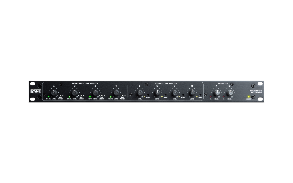 Rane MLM82S оснащений чотирма збалансованими студійними монофонічними / лінійними входами з гніздами XLR та фантомним живленням 15 В постійного струму. Кожен з чотирьох мікрофонних / лінійних входів може бути призначений для виходів A, A + B або B. Для кожного мікрофонного / лінійного входу передбачені незалежні регулятори рівня / посилення та індикатори сигналу / перевантаження. Вимикач Phantom Power та перемикачі Mic / Line розташовані на задній панелі. Фантомне живлення вилучається з будь-якого вхідного набору для роботи лінії.