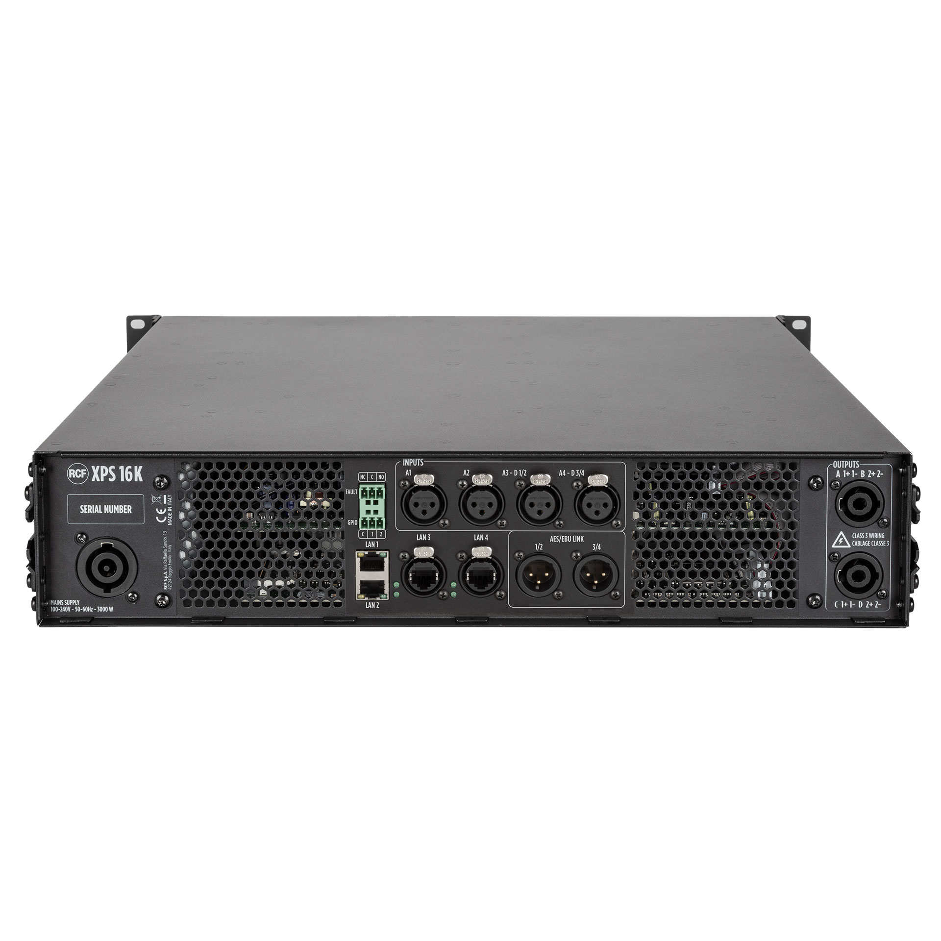 RCF XPS 16K - чотириканальний підсилювач потужності, 4 х 4000 Вт при 2,7 Ом, клас D, 40-бітний процесор з плаваючою комою, частота дискретизації 96 кГц, входи - XLR, AES/EBU, Dante, виходи - speakON, індикатори сигналу, кліпу та несправностей, повний набір захистів, система охолодження з регульованою швидкістю вентиляторів, 483 x 88 x 325 мм, 11,2 кг.
