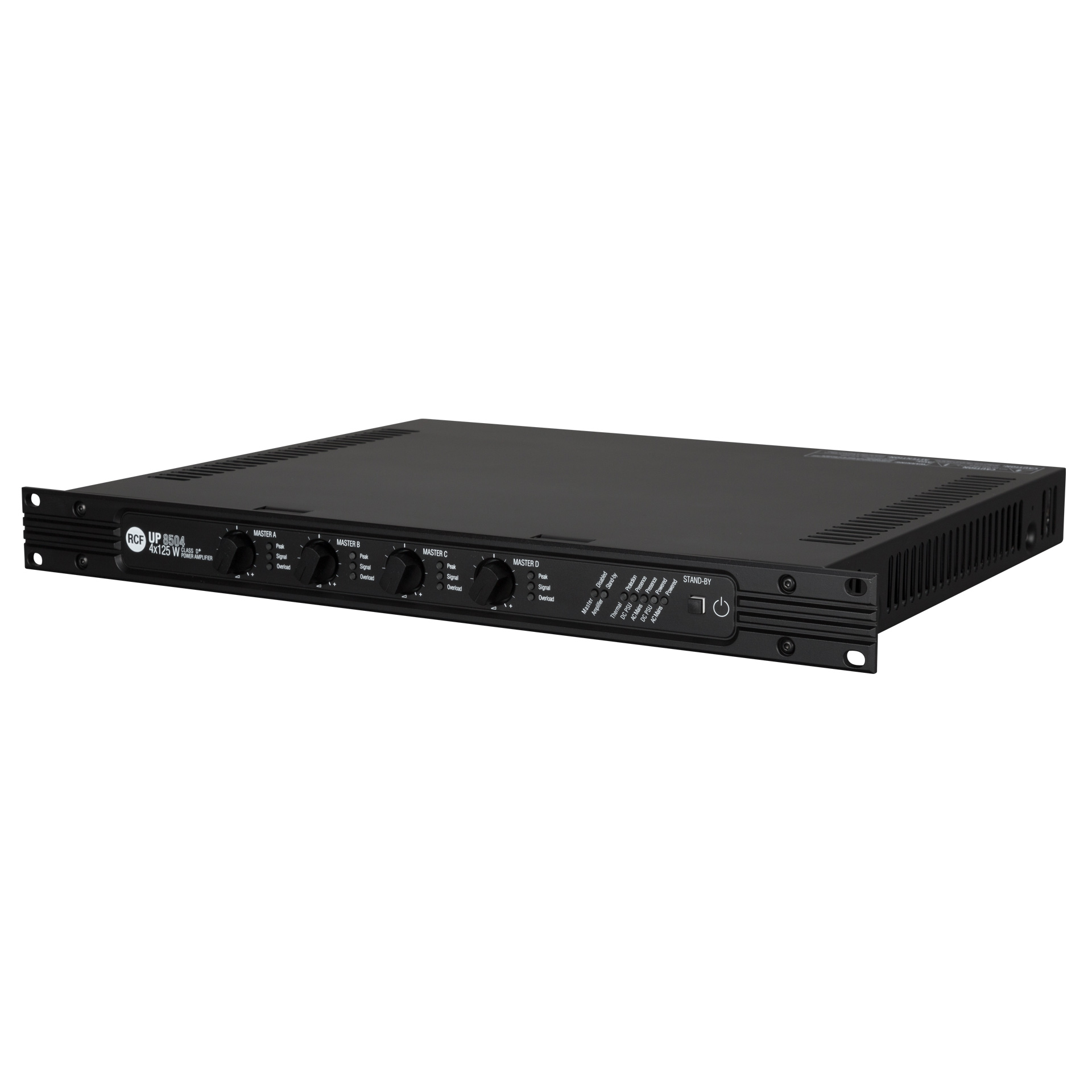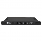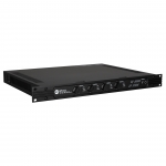 Активний інсталяційний підсилювач 19" 1U, 4 x 125 Вт. 2 входи на канал, подвійне живлення від змінного та постійного струму, пріоритетна схема. Частотний діапазон: 40 Гц - 16 кГц. Підсилювач класу D з високою ефективністю. Світлодіодні індикатори стану на передній панелі. Колір - чорний.