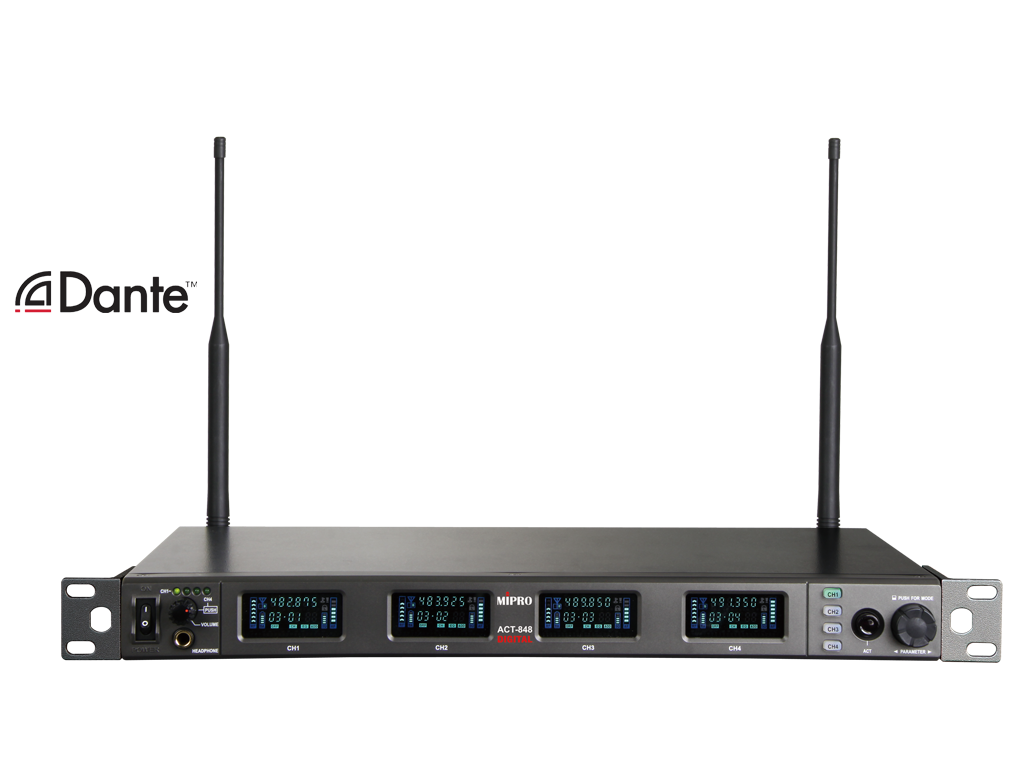 Цифрова чотирьохканальна радіосистема: приймач розмір 1U река, Диверситивний цифровий прийом, виходи XLR аналогові + AES, метал. корпус. Підтримка Dante протоколу.