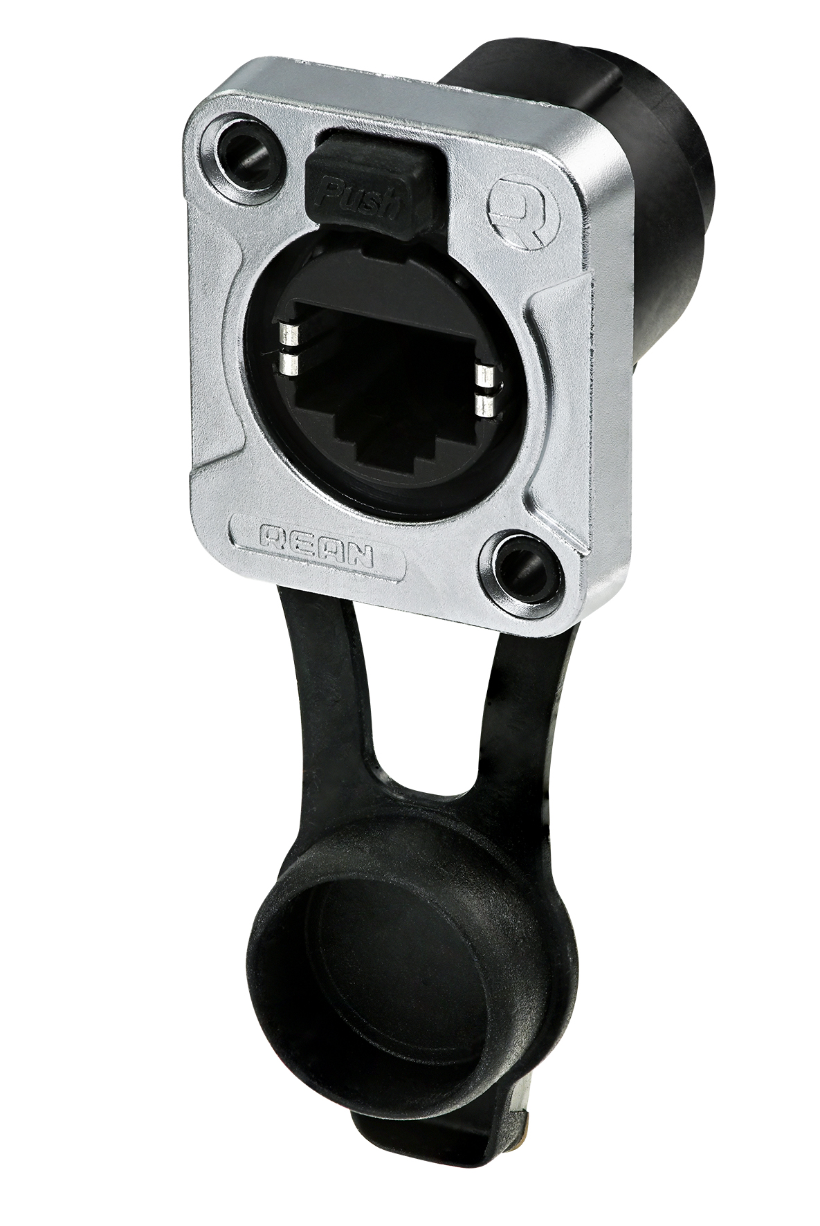 Панельний роз'єм Ethernet RJ45 прохідний з цанговим затискачем, з замком, фланець типу D, гумова кришка, хромований корпус. В упаковці 100 шт.