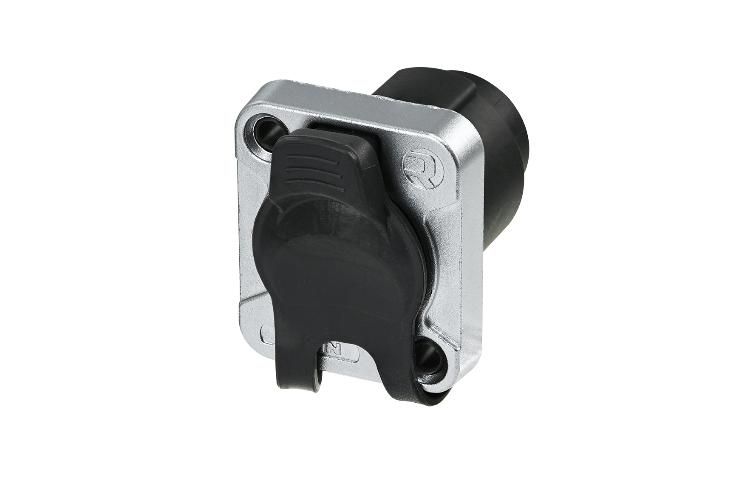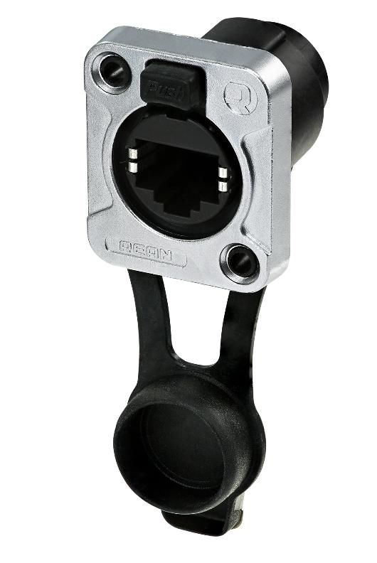 Панельний роз'єм Ethernet RJ45 прохідний з цанговим затискачем, з замком, фланець типу D, гумова кришка, чорний корпус. Пластиковий пакет. В упаковці 100 шт.