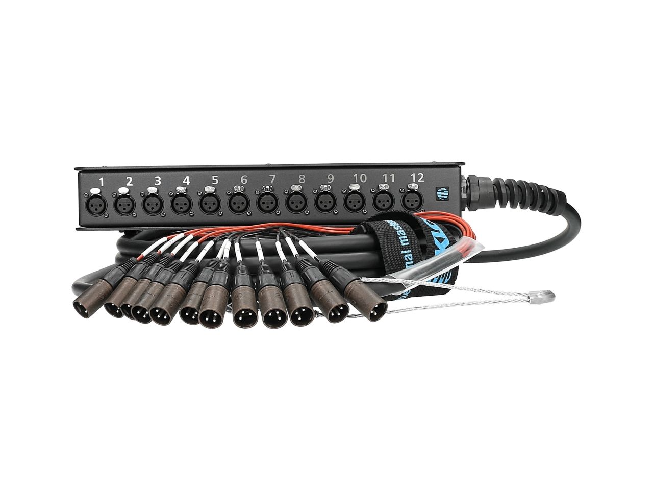 Мультикор 12/0, довжина - 20 м. Роз'єми на кабелі - 12 x XLR-"тато"; панельні роз'єми - 12 x XLR-"мама", алюмінієва коробка (стейджбокс, розміри (ДxШxВ): 384x61x64,5 мм). Гнучкий студійний мультикорний кабель PW..X із перетином провідників Ø 0,22 мм². Для сценічного / студійного використання.