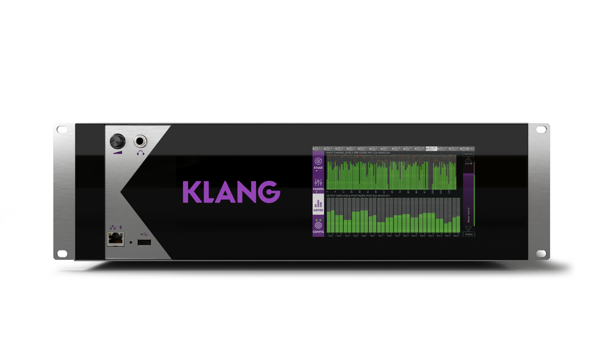 KLANG X-KG-KOND 0 грн. (наявність уточнюйте) KLANG:konductor 16 іммерсивних моніторних міксів, 128 входів (доступні з додатковими картами розширення DMI), 3 слоти розширення DMI по 64 канали кожен. Підсилювач для навушників з регулюванням гучності, сенсорний екран 7", 48/96 кГц, вхід/вихід Word Clock, 3 роз'єми EtherCON, 1 роз'єм RJ45, 2 USB, 2 блоки живлення, висота 3U.