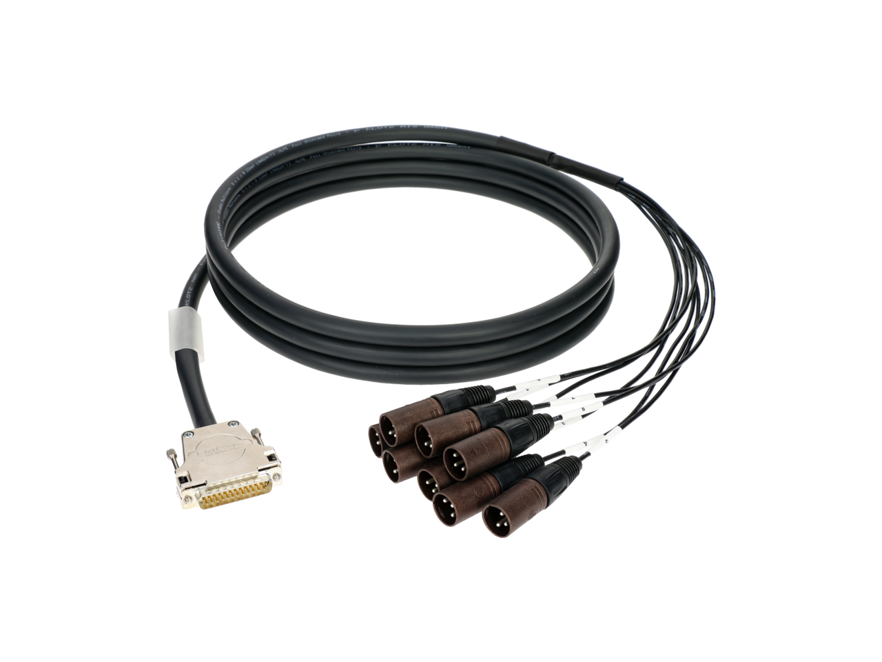 8-канальний аналоговий мультикор, DB-25 (D-Sub 25p male) <> 8 x XLR male (Neutrik), довжина 5 м., кабель PolyWIRE 0.22 мм² з низькою ємністю 85 пФ/м для найвищої якості аудіо, позолочені контакти DB-25, срібні контакти XLR, розпіновка за стандартом AES59 (Tascam DA88), індивідуальні канали захищені міцним вогнетривким плетеним обплетенням, прозорі термоусадочні трубки на обох кінцях для маркування, гвинтове з’єднання UNC 4-40 та M 2.5, сумісний з TASCAM, YAMAHA, MACKIE, Digidesign та Focusrite.