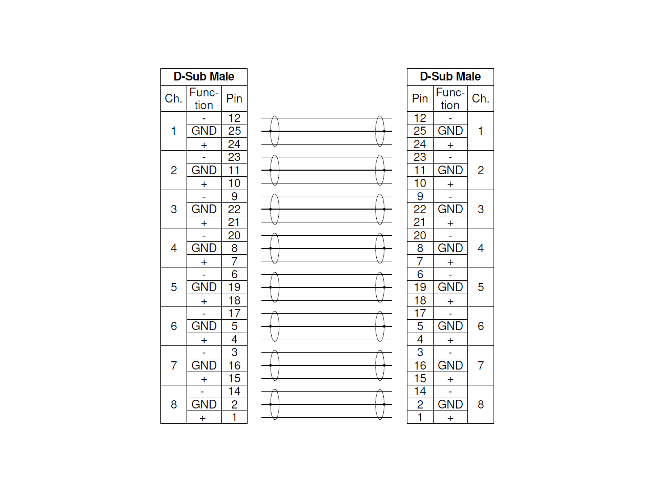 8-канальний аналоговий мультикор, DB-25 (D-Sub 25p male) <> DB-25 (D-Sub 25p male), довжина 1 м., кабель PolyWIRE 0.22 мм² з низькою ємністю 85 пФ/м для найвищої якості аудіо, позолочені контакти обох роз'ємів DB-25, металеві корпуси, розпіновка за стандартом AES59 (Tascam DA88), гвинтове з’єднання UNC 4-40 та M 2.5, сумісний з TASCAM, YAMAHA, MACKIE та Focusrite, підходить для підключення панелей KLTY.