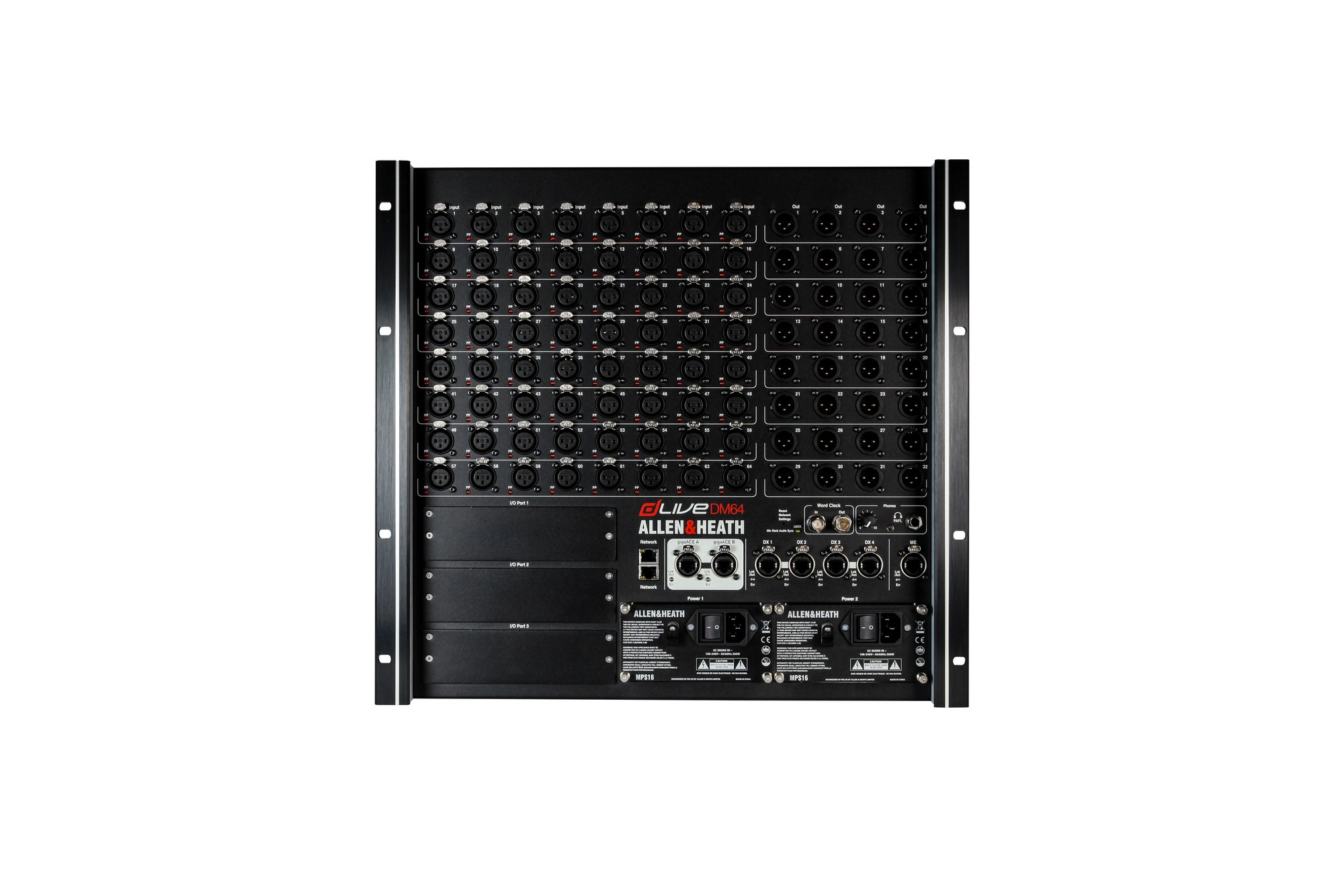 Мікшерний рек системи dLive 96кГц, підтримує 128 вхідних / 64 вихідних канали, 64 локальних mic/line входи XLR, 32 локальних line виходи XLR, 1 x 1/4"+3,5 мм. PAFL, 16 FX процесорів, вбудовані інтерфейси 2 х GigaACE, 2 х DX, 1 х ME, 3 x I/O слоти розширення, Ethernet, Wordclock BNC I/O, 1 блок живлення (розширення до 2-х). Має встановлений модуль UltraFX.