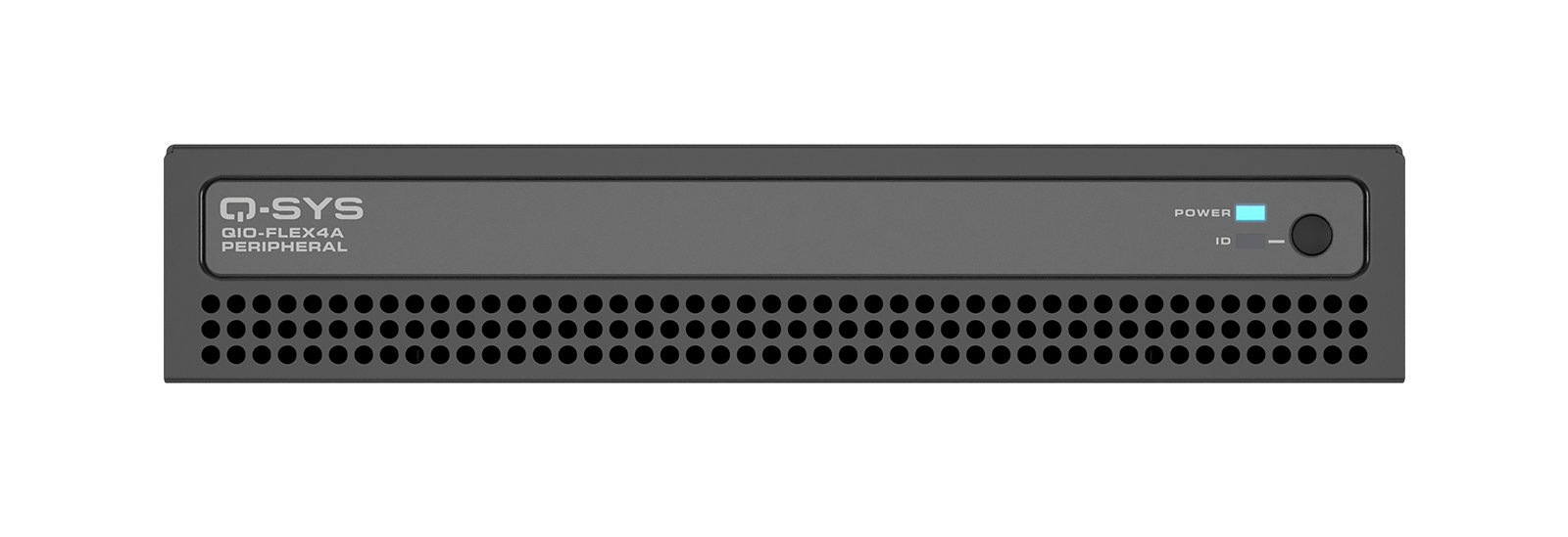 Периферійний пристрій Q-SYS із 4 портами FLEX I/O, 4x8 GPIO, 2 виходами підсилювача, 1 портом RS232. Для роботи в мережі послідовно підключаються до 4 пристроїв, живлення послідовно підключається до 2 пристроїв. Висота 1U-1/2W, живлення через Ethernet або +24 VDC. Комплект для монтажу на поверхні, кріплення продається окремо.