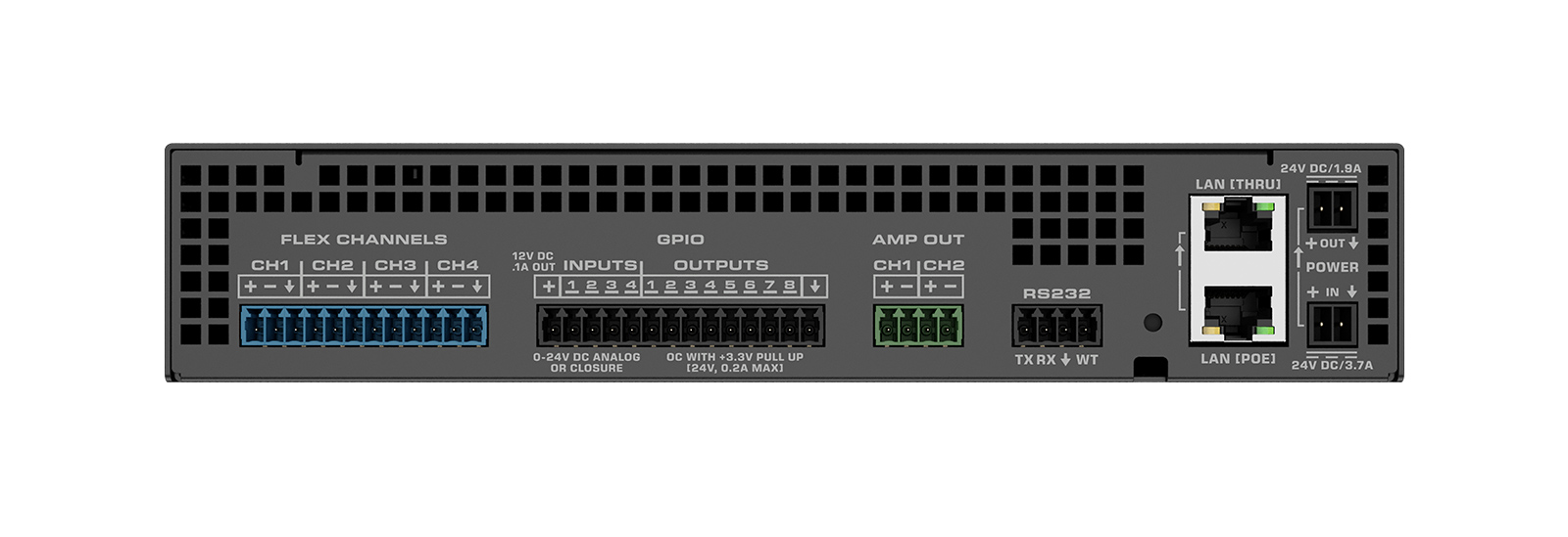 4-канальний інтерфейс вводу-виводу з логічним введенням / виведенням, AES67, USB, підсилювач 2х5 Вт, PoE+, ширина стійки 1/3 U з монтажними вушками (комплект лотка для стійки продається окремо)