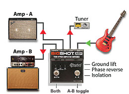 Пасивний ABY-селектор підсилювачів, дозволяє перемикатися між двома підсилювачами або використовувати обидва одночасно без шумів та втрати тону, оснащений вбудованим трансформатором для усунення гудіння, перемикачем 180° для узгодження фази підсилювачів, окремим виходом для тюнера, пасивна схема, частотна характеристика 20 Гц – 20 кГц, посилення -0,3 дБ, вхідні роз'єми 1/4" (6,35 мм) моно-джек, вихідні роз'єми два 1/4" (6,35 мм) моно-джек з можливістю трансформаторної ізоляції для другого виходу, вихід для тюнера, перемикач ISO для активації трансформаторної ізоляції, живлення 9 В постійного струму (адаптер не входить до комплекту, необхідний лише для LED-індикаторів), розміри 99 мм (довжина) x 91,4 мм (ширина) x 50,8 мм (висота), вага 0,56 кг.