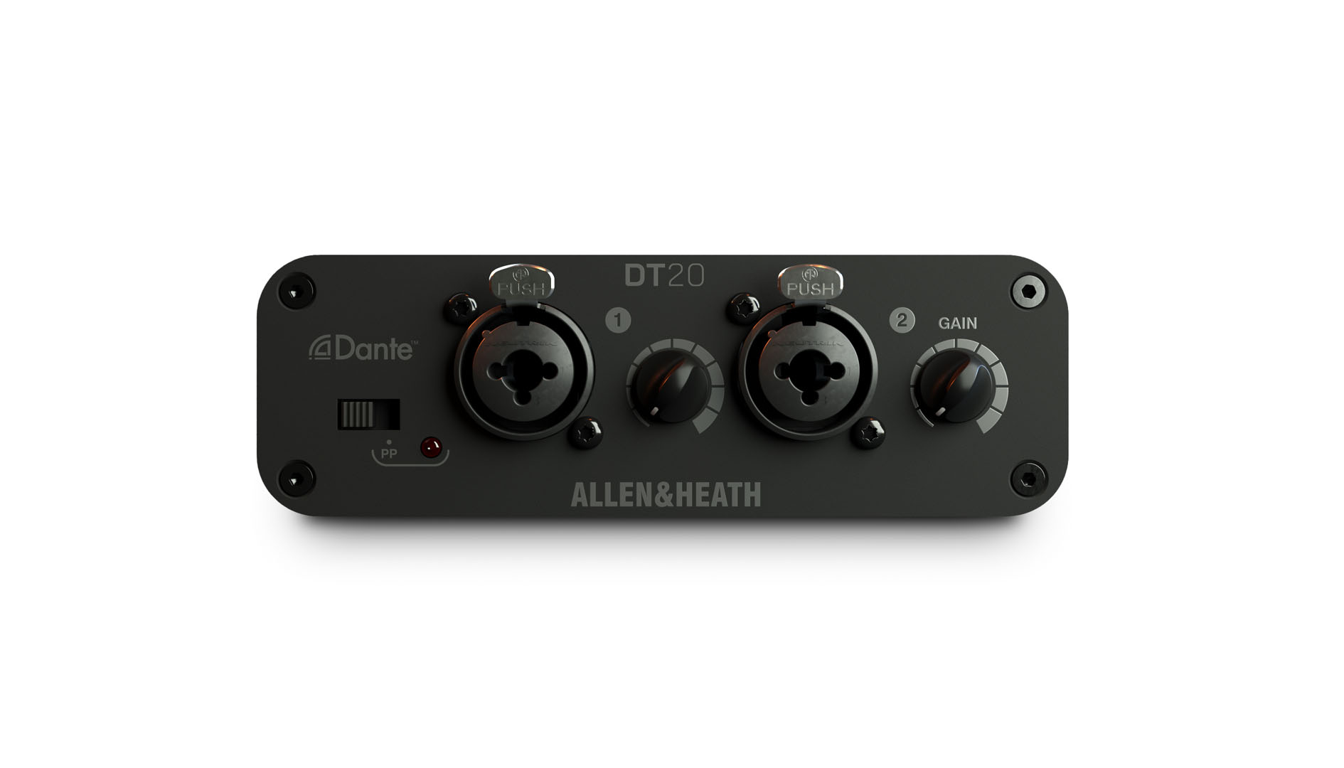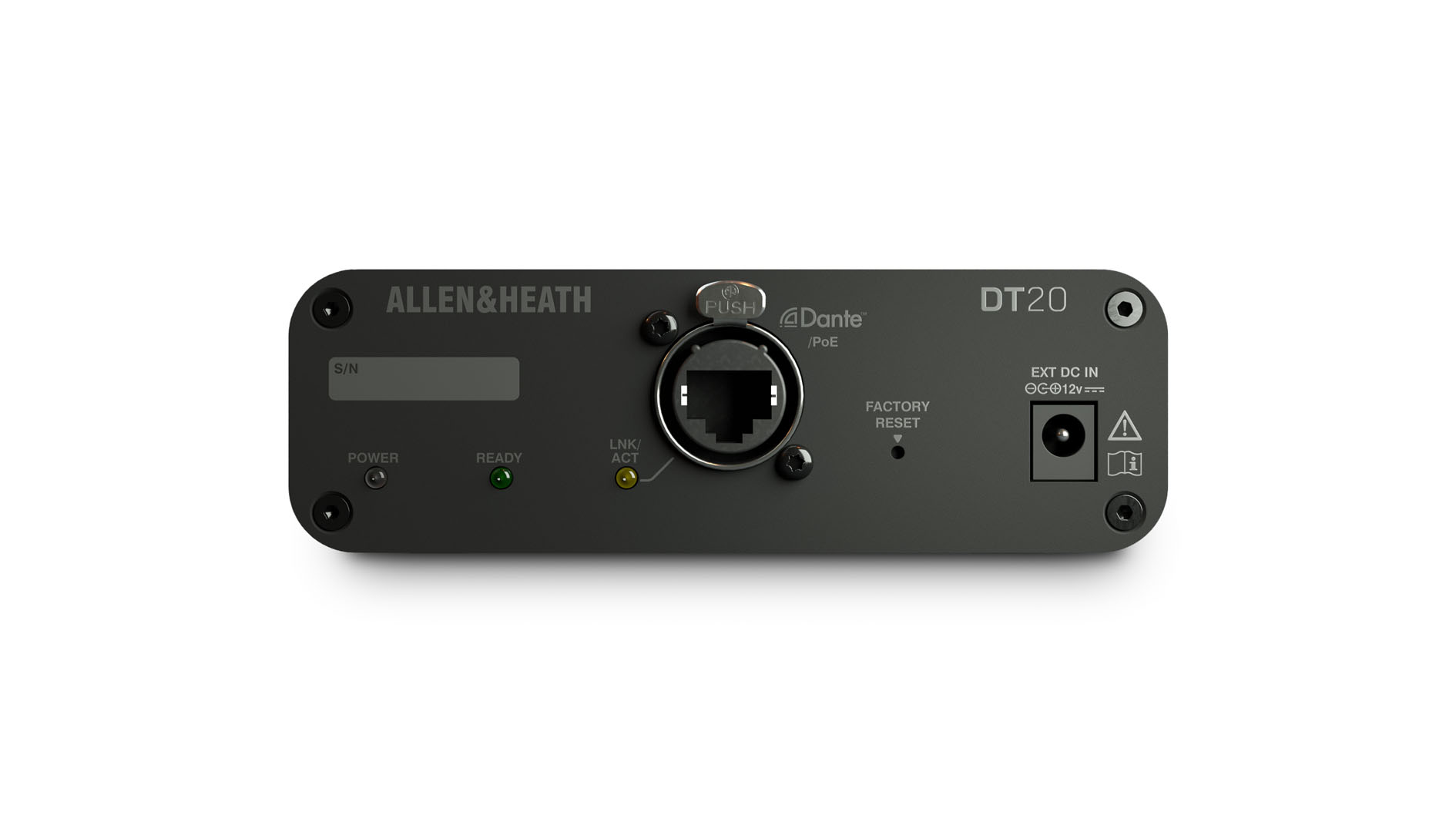 Вхідний інтерфейс Dante, 48 кГц/96 кГц, 2 x XLR combo (комбіновані мікрофонні/лінійні входи, регулятор чутливості вхідних каналів, перемикач фантомного живлення 48 В зі світлодіодним індикатором), живлення від PoE або 12 В постійного струму, EtherCon, алюмінієвий корпус. В комплекті кріплення для поверхневого монтажу. Блок живлення не входить в комплект. Опціональне кріплення для монтажу в рекову стійку (DT-RK19, продається окремо).
