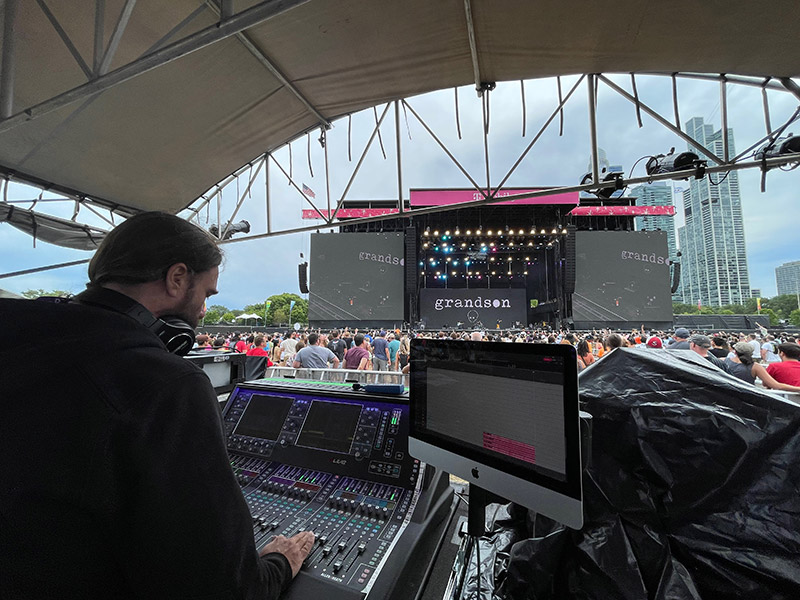 Мікшерні консолі dLive S5000 працювали на фестивальній сцені T-Mobile у чиказькому Грант Парку Справжньою родзинкою другого дня фестивалю Lollapalooza 2021 став виступ grandson (англ. – “онук”), пісні якого займають високі місця в чартах Billboard. У творчості grandson гармонійно переплітаються блюзове та хард-рок гітарне звучання, біти та електронна музика. Фестиваль Lollapalooza 2021 став однією з перших масових подій після карантинних обмежень, і він став прикладом того, якими можуть бути живі концерти у найближчому майбутньому. За словами організаторів, приблизно 90% з 385 000 відвідувачів фестивалю пред’явили документи про вакцинацію, а ще 8% мали актуальний негативний тест на COVID. Проаналізувавши статистичні дані через кілька тижнів після фестивалю, чиказькі чиновники з охорони здоров’я заявили, що Lollapalooza не став подією-суперпоширювачем вірусу. Тріумфальний виступ grandson, який пройшов під девізом “шоу має продовжуватись”, відбувся з використанням пари з’єднаних в одну мережу цифрових мікшерних систем Allen & Heath dLive, одна з яких керувала моніторами на сцені, а інша мікшувала основний FOH звук на фестивальній сцені T-Mobile у Чикаго. ![]() «dLive – це найгнучкіша мікшерна система на сьогоднішньому ринку, – зазначає Тіб Чабаї, FOH звукоінженер grandson. – Вона чудово звучить, і мені подобаються дивовижні моделі компресорів DEEP, вбудовані прямо в канальні лінійки. Вбудовані ефекти – найкращі з тих, які я коли-небудь використовував». Унікальна архітектура DEEP для консолей Allen & Heath, побудованих на процесорах XCVI, дозволяє використовувати такі обробки, як, наприклад, вінтажні моделі компресорів безпосередньо у вхідних каналах та шинах міксів. Такий підхід дозволяє інженеру використовувати потужні творчі інструменти прямо на льоту, без затримок та тяганини з ліцензіями, з якими зазвичай пов’язане використання зовнішніх плагінів. Чабаї продовжує: «Звичайно, всі ці інструменти втрачають свою цінність, якщо ви не можете швидко до них дістатися. На щастя, користувацький інтерфейс dLive дуже простий, потужний і швидко адаптований». Такий підхід до реалізації користувальницького інтерфейсу в Allen & Heath називають Harmony (англ. – “гармонія”). Знайомство з ємнісним сенсорним інтерфейсом на dLive відбувається миттєво, екран чітко реагує на натискання, прокручування та перетягування саме так, як ви цього очікуєте. Сенсорний екран доповнюється фізичними кнопками та поворотними регуляторами, які забезпечують безпосередній тактильний контроль над ключовими функціями обробки, що працює у повній гармонії з візуальним відображенням керування на екрані. Для виступу grandson на сцені T-Mobile у якості FOH мікшера використовувалась консоль dLive S5000 з мікшерним реком DM0. Монітори мікшувались за допомогою ще однієї консолі dLive S5000 та мікшерного река DM64. Обидві консолі були з’єднані в мережу за допомогою цифрового спліту gigaACE, який забезпечує передачу 128 x 128 каналів аудіо з частотою дискретизації 96 кГц. ![]() «Це просто чудово – знову повернутися до своєї роботи, – каже моніторний інженер grandson Кріс Рубі, – за допомогою dLive я змікшував класний звук на одному з найвідоміших фестивалів. Я погоджуюся з Тібом щодо плагінів DEEP. Вони передають всі нюанси класичного аналогового обладнання, даючи нам неймовірні можливості робити наші мікси саме такими, як нам потрібно. Я однозначно є фанатом dLive». «Ми бачимо, як багато інженерів