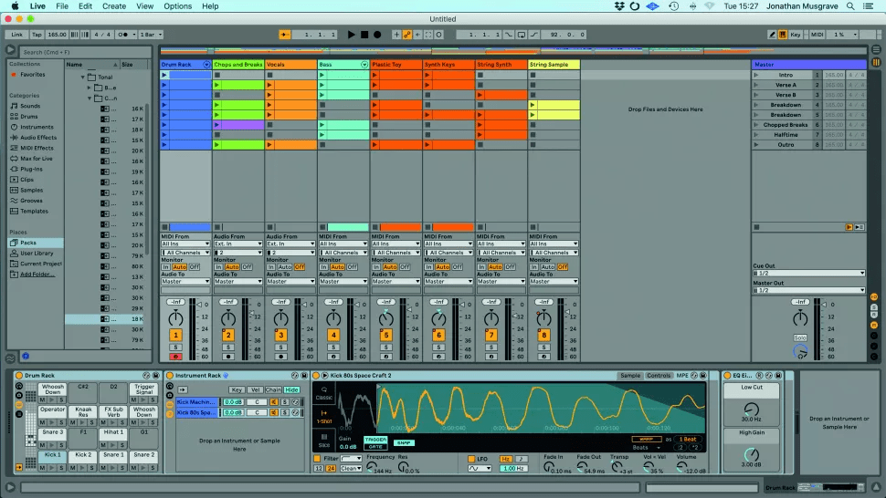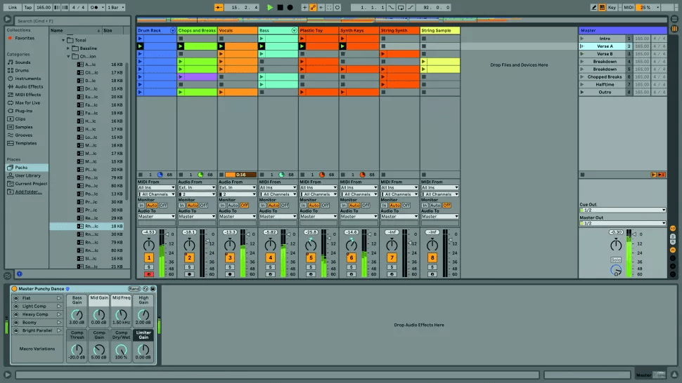 Друга частина посібника Ableton Live 11 Lite від Computer Music знайомить вас з інтерфейсом та навігацією цього софту. На на веб-сайті Ableton доступні платні повнофункціональні версії Ableton Live, а ми продовжуємо тренуватися на Live 11 Lite! ![]() Крок 1. Для ознайомлення ми скористаємося демонстраційним треком в Live 11 Lite. Цей сет (файл .als) має завантажитись автоматично, коли ви авторизуєте свою копію Live Lite. Якщо вам потрібно завантажити цей сет заново, знайдіть Demo Songs, який в ОС Windows знаходиться в папці Program Data, а в OS X – у файлі самої програми, і щоб побачити його виберіть “show package contents” (показати вміст пакета). ![]() Крок 2. Live 11 Lite використовує розкладку з центральним робочим простором, обрамлений різними розкладними панелями. Деякі панелі мають вкладки з кількома розділами, а транспортна панель знаходиться у верхній частині екрану. Спробуйте перетягнути роздільники панелей, щоб змінити їхній розмір. ![]() ![]() Крок 4. У нижній частині робочої області знаходиться Detail View (детальний перегляд), і знизу є дві вкладки: Clip View (перегляд кліпу) та Device View (перегляд пристрою). В режимі Clip View ви побачите MIDI або аудіо, залежно від типу кліпу. А в Device View будуть показані пристрої, які використовуються в цій доріжці, наприклад, натиснувши на вокальний трек “Vocal”, ви побачите тут різні ефекти. ![]() Крок 5. Live пропонує два способи роботи. Два види, Session (сесія) і Arrangement (аранжування), можуть використовуватись окремо. Однак вони також співіснують у вашому сеті Live Set, тому можуть працювати і разом, ми розглянемо це пізніше. Спробуйте перемикатися між двома режимами перегляду в демонстраційному сеті за допомогою маленьких піктограм із трьома вертикальними або горизонтальними лініями або за допомогою клавіші Tab. ![]() Крок 6. Session View (перегляд сесії) пропонує нелінійний робочий процес та ідеально підходить для чорновиків ваших ідей або для живих виступів. Структурними блоками сесії є MIDI або аудіо кліпи, які мають визначену початкову та кінцеву точки. Вони розташовані у вертикальних доріжках Tracks і можуть запускатися як окремо, так і як частина горизонтальних сцен. Тут ми запускаємо сцену “Verse A” за допомогою її кнопки Play. ![]() Крок 7. Arrangement View – це горизонтальна шкала часу, де ви можете вільно впорядковувати та записувати MIDI та аудіо кліпи, а доріжки збігаються з доріжками у Session View. Для збільшення або зменшення масштабу перетягніть курсор на лінійку тактів та таймкоду Beat-Time угорі. Клацніть в області аранжування, щоб вибрати позицію відтворення, клацніть на Scrub Area вгорі для постаку відтворення. ![]() Крок 8. Існує багато способів розпочати відтворення в Live Lite, включно з відтворенням кліпу сесії, коли решта вашого сету відтворюється в режимі аранжування. Клацніть на помаранчевому значку Back To Arrangement (назад до аранжування), щоб відновити відтворення аранжування, або натисніть кнопку транспорту Stop All Clips (зупинити всі кліпи) у режимі Session View, щоб повернутися до перегляду сесії. ![]() Крок 9. І нарешті, ви можете налаштувати загальний вигляд Live Lite за своїм бажанням. Перейдіть до меню Preferences (налаштування) та відкрийте вкладку Look Feel. Тут ви можете вибрати кольори за замовчуванням для треків та кліпів або вибрати одну з п’яти загальних колірних тем із налаштуваннями яскравості, інтенсивності тощо. Джерело Читайте також 1 частину циклу навчальних статей для початківців, присвячених Ableton Live 11.