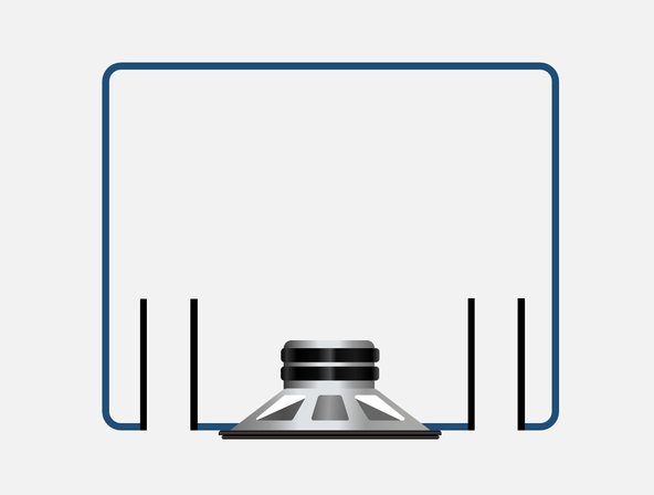 Фазоінверторна або вентильована конструкціяВентильований кабінет фазоінверторної кострукції має один або кілька портів, які дозволяють вирівнювати тиск всередині та зовні корпусу. Порти збільшують вихідну ефективність системи на своїй резонансній частоті, забезпечуючи додаткову площу поверхні виштовхуваного повітря, що призводить до розширення діапазону низьких частот та підвищення SPL.![]() Рис. 2 – Кабінет вентильованої конструкції з двома передніми портами та НЧ-драйвером. Сабвуфери фазоінверторної конструкції, як правило, слід використовувати в поєднанні з електричним фільтром зрізу НЧ, який обмежує частоти нижче частоти зрізу. Оскільки нижче частоти налаштування корпусу для НЧ-динаміка немає акустичної підвіски, якщо він відтворює сигнали нижче цієї частоти, його підвіска може бути пошкоджена через надмірний зворотній хід дифузора. Маючи приблизно на 3 дБ вищу ефективність порівняно з закритими корпусами, вентильовані бокси можуть значно, а якщо точніше, то вдвічі, знизити вимоги до потужності підсилювачів. Наприклад, сабвуфер QSC KS118 є 18" активним сабвуфером прямого випромінювання, має кабінет вентильованої конструкції та здатний виробляти піковий SPL у 136 дБ на відстані 1 метр з пікової потужності 3600 Вт. Переваги: