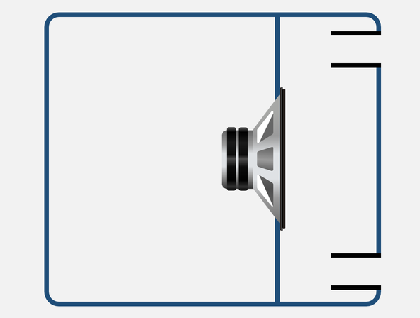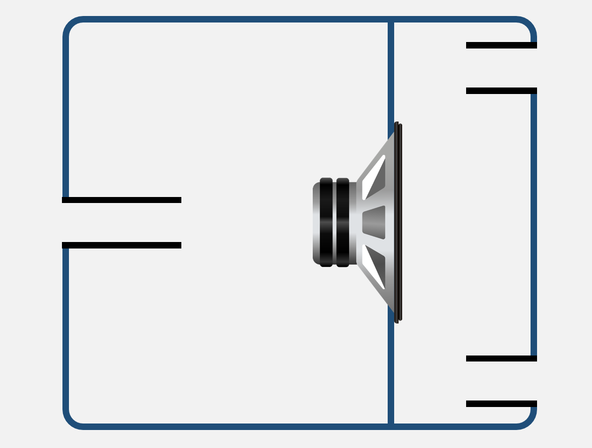 Конструкція бенд-пасЦей особливий тип корпусу сабвуфера має дві окремі камери. Первинна камера, у якій знаходиться НЧ-драйвер, може мати закриту або вентильовану конструкцію, а вторинна камера створює так званий ефект “смугового пропускання”.Загалом бенд-пас сабвуфери є високоефективними у відтворенні глибоких басів в обмеженій смузі пропускання. Хоча така конструкція вимагає ретельного і тонкого налаштування, в результаті підвищення рівня звуку може становити до 8 дБ. Однак, при цьому НЧ-драйвер, як підвіска, так і дифузор, має бути механічно міцним та надійним. Бенд-пас з однією вентильованою камероюЦя конструкція має встановлений у закритій камері НЧ-драйвер, який випромінює у вентильовану камеру, що змінює резонанс драйвера. Така схема імітує роботу електричного смугового фільтра 4-го порядку. змінюючи резонанс драйвера. Закрита камера при цьому має спад низьких частот 12 дБ/окт, а вентильована вторинна камера створює спад високих частот на 12 дБ/окт.![]() Рис. 3 – Бенд-пас кабінет має вторинну вентильовану камеру з двома портами спереду та НЧ-драйвер у закритій первинній камері