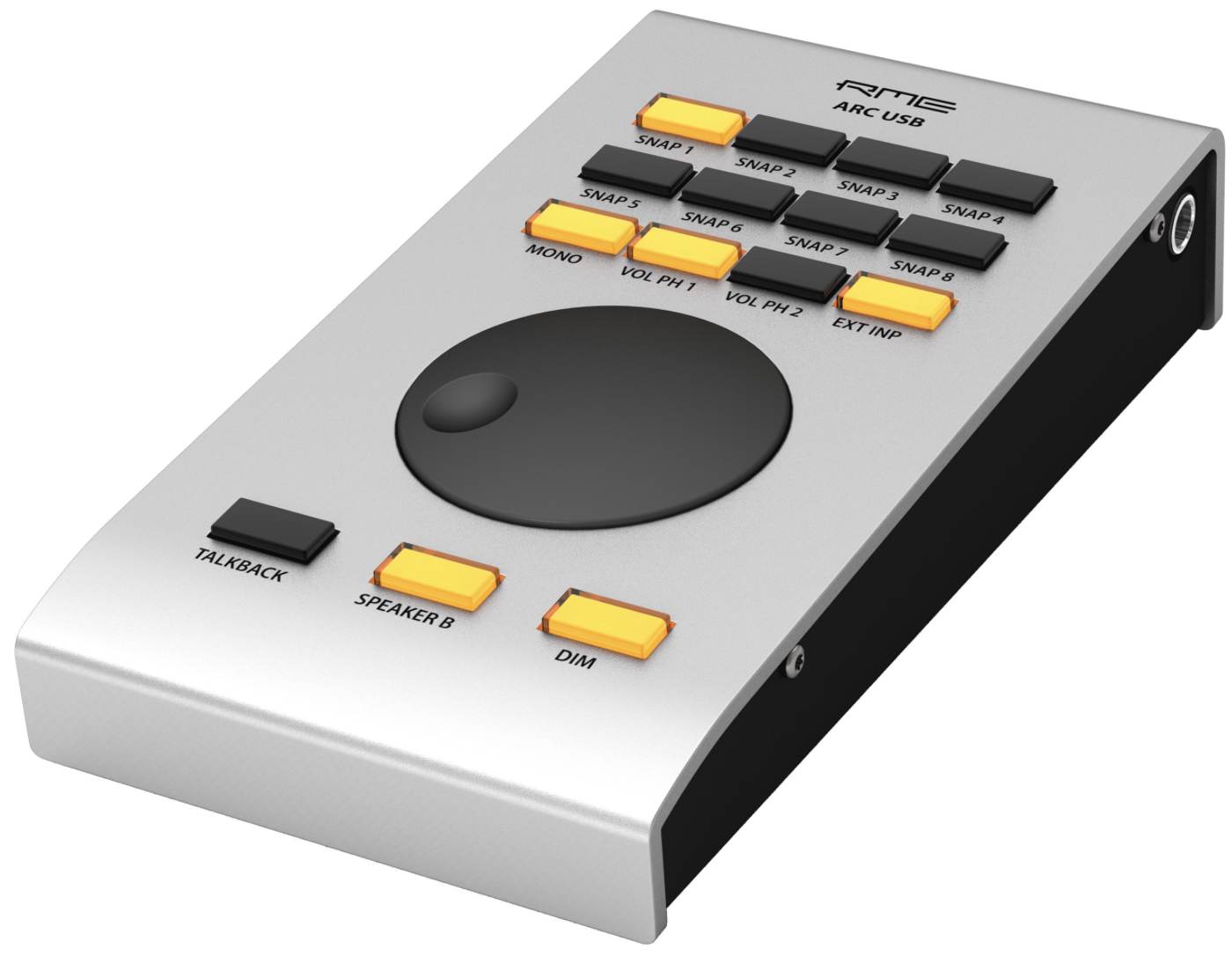 Опціональний пульт ARC USB підключається до вашого комп’ютера через USB і спілкується безпосередньо з TotalMix FX. Він має 15 повністю призначуваних кнопок з підсвіткою, одне енкодерне коліщатко та TS-роз’єм для підключення педального перемикача.