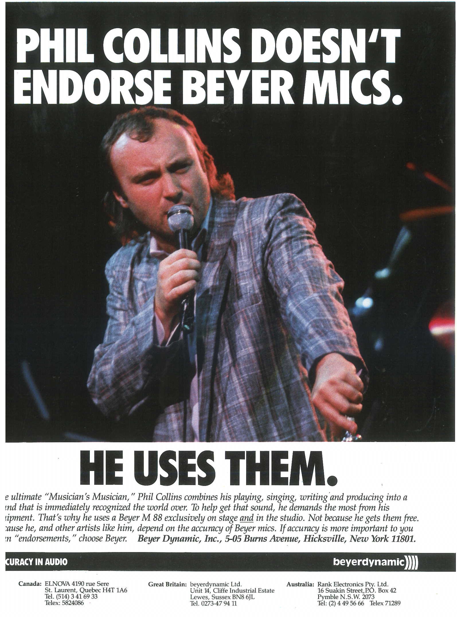 1980-ті роки — велике десятиліття для популярної музики, саме тоді серед зіркових музикантів вперше з’явились ендорсери брендів обладнання та інструментів. Одним із найвідоміших облич beyerdynamic на той час був легендарний Філ Коллінз. Залучення професійних музикантів у рекламі підкреслювало високий професіоналізм використовуваної ними продукції. Якщо такий всесвітньо відомий артист, як Філ Коллінз довіряє свій голос мікрофонам beyerdynamic, то ви також можете сміливо це робити!