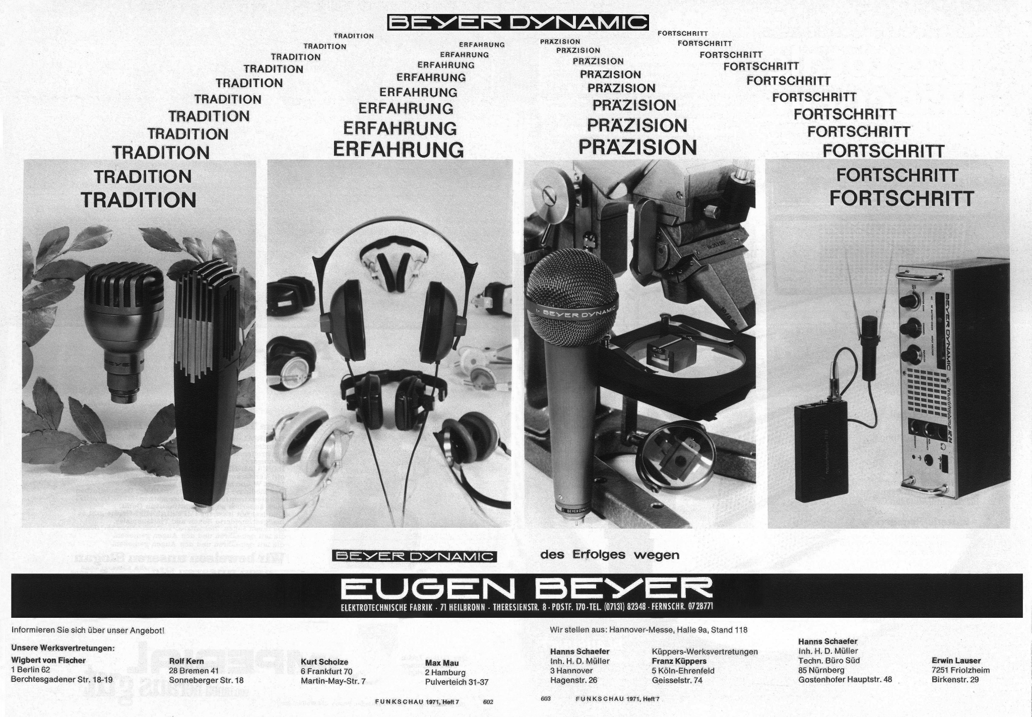 Широкий асортимент бренду візуально представлений у рекламі, що чітко демонструє, наскільки розвиненою була компанія вже на початку 1970-х років. Традиції, досвід, точність і прогрес. Використання цих корпоративних цінностей у рекламі передає всю філософію beyerdynamic.