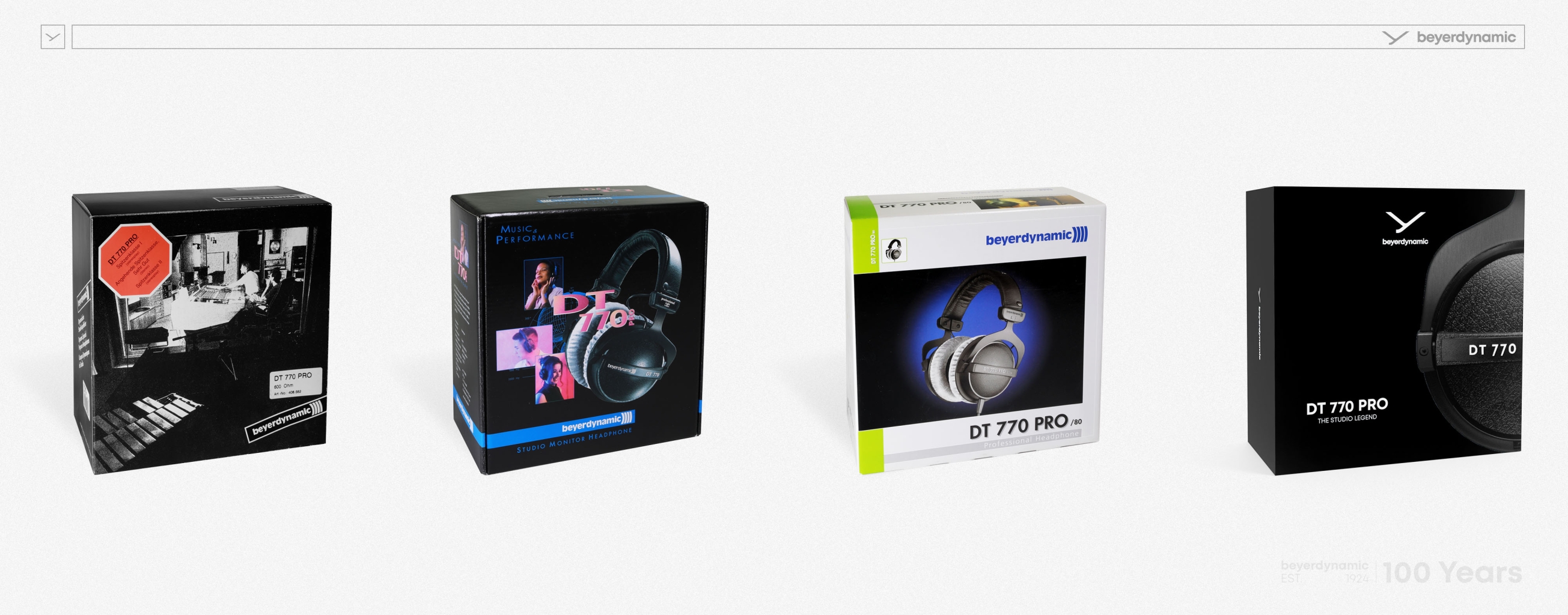За кілька десятиліть еволюціонувала не тільки реклама бренду beyerdynamic, а й пакування його продукції. Адже якісна та приваблива упаковка також є засобом успішної комунікації з клієнтом, яка постійно адаптувалась, крокуючи з часом. Яскравим прикладом є різні дизайни пакування класики бренду — студійних навушників DT 770 PRO.