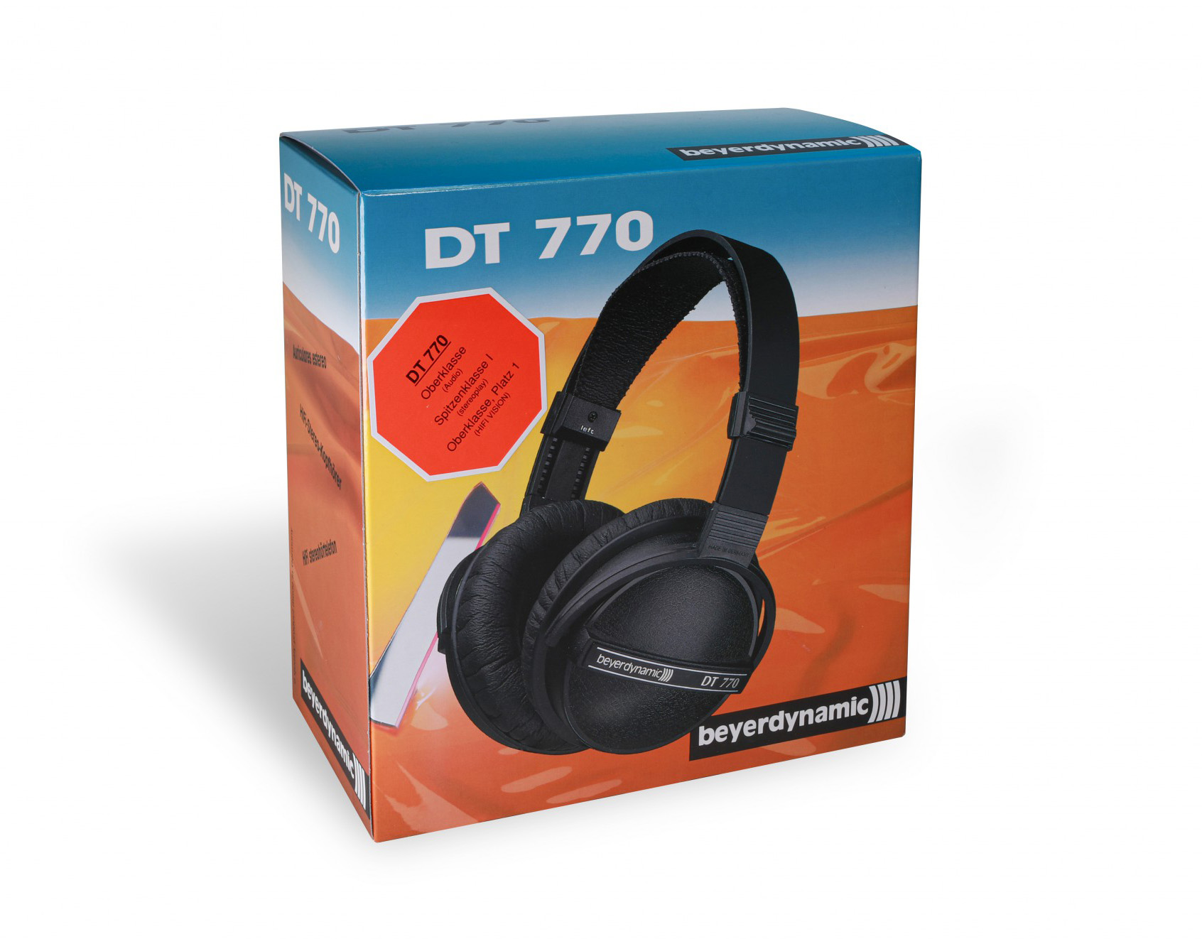Для порівняння нижче показано упаковку любительських Hi-Fi навушників DT 770 з 1980-х років. На відміну від більш стриманих кольорів пакування моделі PRO, тут акцент зроблено на яскраві кольори, які ще більше підкреслюють чорний елегантний дизайн виробу, привертаючи увагу покупця.
