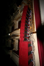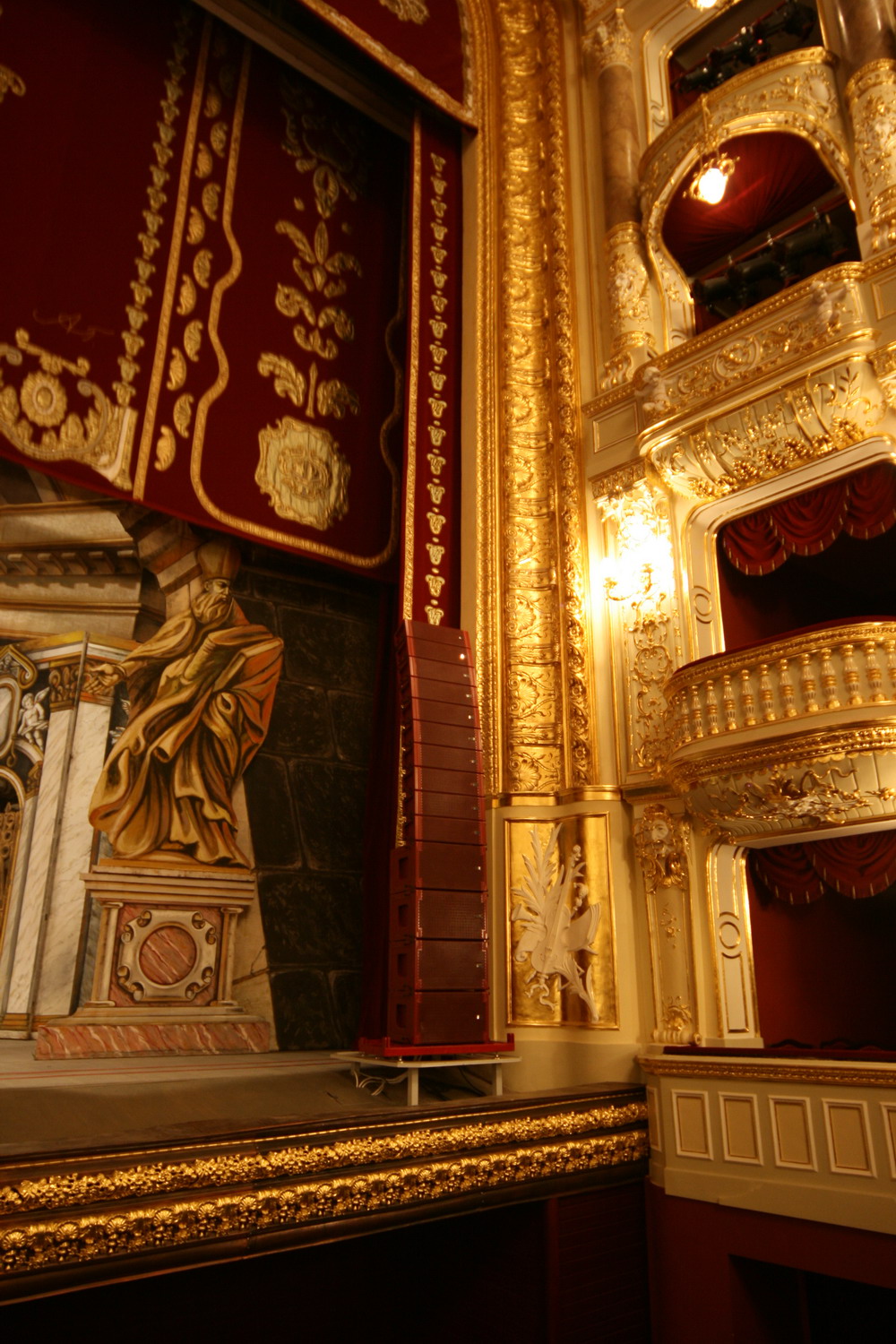 Установленные по краям сцены линейные массивы MeyerSound остаются невидимыми для зрителя благодаря своей компактности и специально подобранному в тон занавесу и всей мягкой обивке театра цвету. Акустические системы, установленные в Одесском Национальном Оперном Театре были специально разработаны и произведены на заводе MeyerSound в г. Беркли, Калифорния, США.