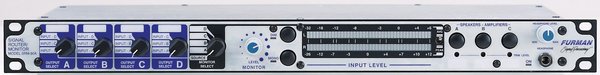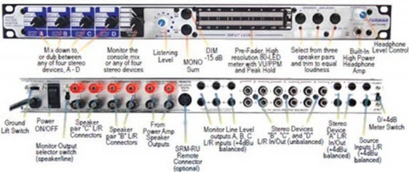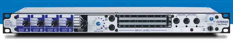 Furman SRM-80 AE -підсилювач для навушників, має два симетричних входу на джеках для підключення джерела сигналу (передбачається підключення виходів мікшера для апаратної), чотири пари входів і чотири пари виходів для підключення трековий пристроїв (одна пара симетричних входів-виходів на джеках і три пари на роз'ємах RCA), два виходи для підсилювача потужності і два виходи для активних моніторів (всі симетричні, на джеках), входи для підсилювача потужності і виходи для двох пар пасивних акустичних систем (все на закручується роз'ємах). У кожного виходу для трековий пристрою на передній панелі є перемикач вибору джерела сигналу (можливий запис на кілька пристроїв одночасно). Там же знаходяться перемикач вибору джерела для моніторингу, регулятор мониторного рівня, кнопки зниження рівня на 15 дБ і підсумовування в моно (для моніторів і навушників), два 40-сегментних індикатора рівня (до регулятора, є функція затримки піків і перемикач показу пікового або середнього рівня, точність +/- 0,5 дБ), кнопка вибору пар