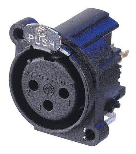 XLR-гніздо 3-контактне, "мама" для шасі, пластиковий корпус, сталевий замок-фіксатор, контакт 1 відключений від шасі і землі, вертикальний монтаж на платі. В упаковці 100 шт.