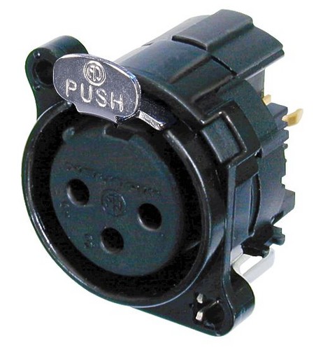 XLR-гніздо "мама" 3-контактне для шасі, металевий корпус, з пружинним заземлення на корпус, вертикальний монтаж на платі, чорний