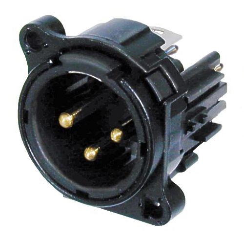 XLR-гніздо "тато" 3-контактне для шасі, металевий корпус, сталевий замок-фіксатор, вертикальне закріплення на платі, чорний