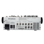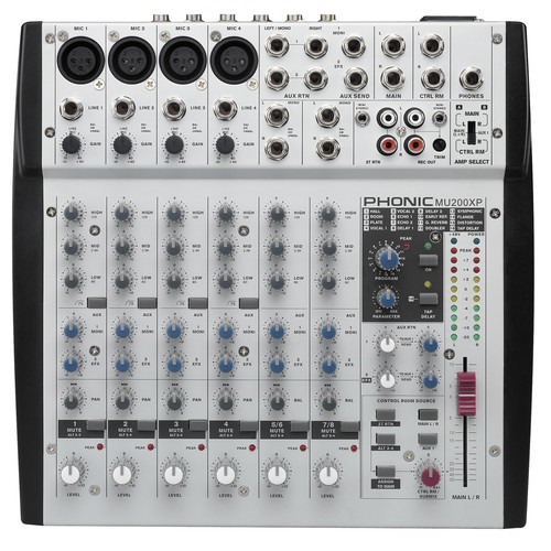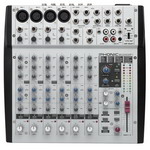 Активний мікшерний пульт, 8 каналів: 4 мікрофонних, 2 стерео, 2 AUX Send & Return (1/4 "Jack), вбудований процесор ефектів 16 програм, підсилювач стерео 2 х 100 Вт / 4 Ом, 274х270х100мм, 3,2кг