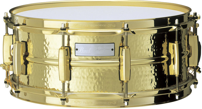 Малий барабан, іменна модель Jimmy DeGrasso, 14 * 5,5 ". Корпус з кованої латуні. Золотиста фурнітура. Штамповані обручі Super Hoop II, 10 лагів CL-55G, болти SST-5052, стрейнер SR-17AG / SR-18EG, подструннік SN-1420D