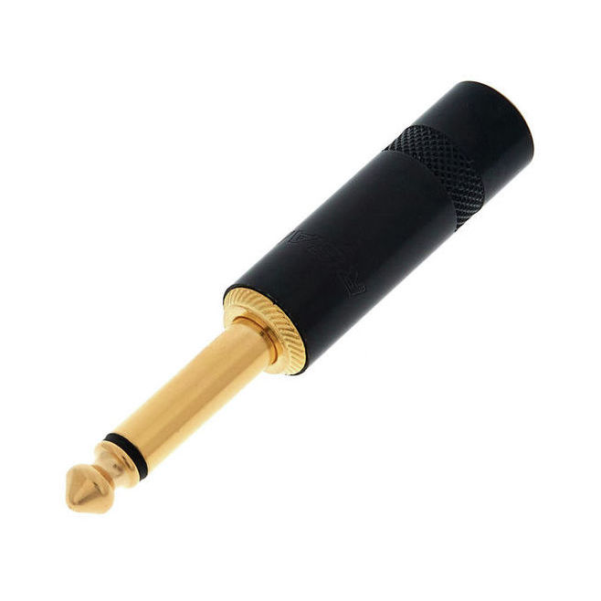 1/4" (6,3 мм) кабельний моно джек "тато" (штекер), довга точена латунна ручка, без заклепки. 2-полюсний. Для кабелів діаметром до 6 мм. Чорна металева ручка, позолочені контакти.