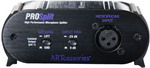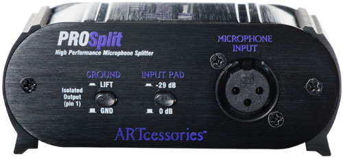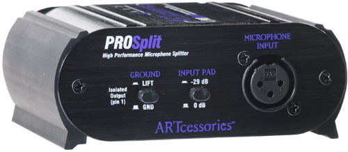 ART ProSplit, пасивний 2‑канальний мікрофонний спліттер, забезпечує один прямий XLR‑вихід (із передачею фантомного живлення) та один ізольований трансформатором XLR‑вихід, має вбудований перемикач ground‑lift для усунення ґрунтових завад, пад‑перемикач входу для роботи з лінійними сигналами, не потребує живлення, компактний та міцний корпус, ідеальний для інсталяцій у FOH/моніторних консолях та запису аварійних треків, надійний інструмент для студій та концертних застосувань