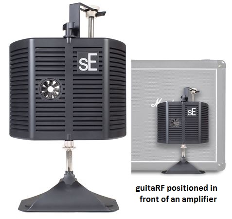 sE Electronics guitaRF- Мікрофонний екран-стійка для звукозапису інструментів, кріплення для двох мікрофонів, підлогова стійка в комплекті, можливість кріпити на будь-яку мікрофонну стійку. sE Electronics guitaRF - діє як фільтр відображень, ізолятор, подвійна мікрофонна стійка і утримувач для двох мікрофонів: конденсаторного з великою діафрагмою або стрічкового і динамічного або мікрофона з маленькою капсулою. Плюс це все в одному пристрій здатний ідеально вирівнювати фазу двох капсул для досягнення максимальної віддачі. Кріплення guitaRF регулюються в трьох осях - по вертикалі, глибині і горизонталі, тим самим Ви зможете знайти ідеальне розташування для будь-якого мікрофона. Сам фільтр і мікрофонний комплекс також може рухатися вгору і вниз для точного розташування мікрофону під конусом динаміка або якщо потрібно, фільтр можна зняти з підстави і встановити його на будь-яку мікрофонну стійку. На задній панелі фільтра так ее можна знайти зручне кріплення для мікрофонних кабелів.