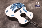 Електроакустична гітара. Форма - гранд аудиторіум. Топ - цільний, ситхінська ялина. Задня дека та боковини - махагон. Гриф - африканський махагон. Брідж та накладка на гриф - штучний ебоні. Фініш - білий принт з синім пір'ям. Електроніка - TYMA T-50. В комплекті - фірмовий гітарний чохол, ганчірка, ремінь.