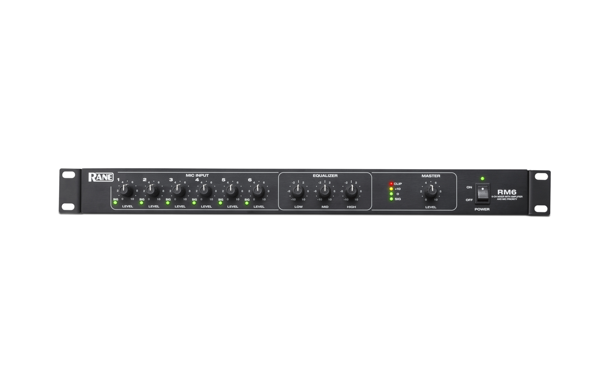 RM6 - це 6-канальний мікшер із вбудованим одноканальним підсилювачем 120 Вт Class-D. Він має комбіновані роз'єми XLR / TRS з перемиканням MIC, LINE та фантомним живленням. На додаток до посиленого виходу на роз'ємах колонок Euroblock, входять два лінійних виходи XLR. Варіанти виходу на динамік - 4-Ом або 70 / 100В.
