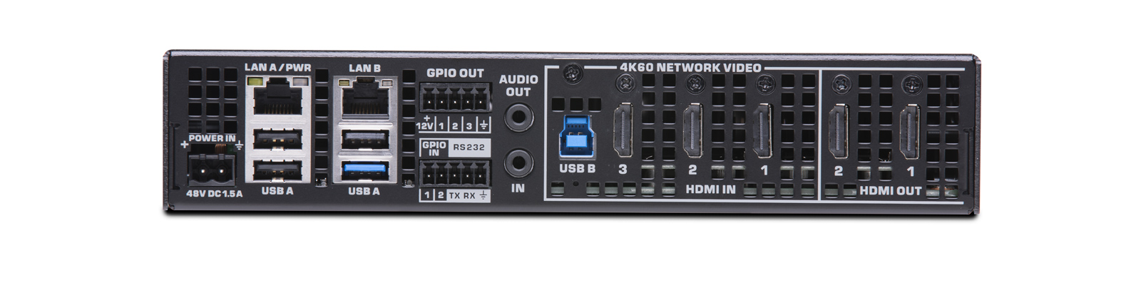 Кінцева точка мережевого відео 4K60 4:4:4 для екосистеми Q-SYS, програмно налаштовується як кодер або декодер. 3 входи HDMI 2.0, 2 виходи HDMI 2.0. Підтримує режим роботи "Q-SYS Core Mode" для аудіо DSP з локальним перемиканням відео (без кодування та декодування) та AV-Bridging.