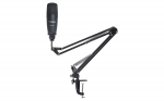 Комплект для підкастів, проведення прямих ефірів або запису. Складається з високоякісного USB-конденсаторного мікрофона та настільного кріплення з суцільно металевої конструкції. Легко регулюється та забезпечує гнучкість та зручність у використанні. Фіксатор та шарнірні затискачі дають можливість надійно закріпити конструкцію на будь-якому столі або поверхні столу. Діаметр мембрани: 13мм. Частотний діапазон: 20–17 000 Гц. Кардіоїда. Чутливість: -34 дБ ± 2 дБ. Максимальний звуковий тиск: 132 дБ. Співвідношення сигнал / шум: 78 дБ. Вага настільного тримача: 382 г. Можливість регулювання кута нахилу та висоти. Комплектація: USB мікрофон, шарнірний кронштейн, настільний затискач, USB-кабель, монтажне кільце для мікрофона, керівництво користувача.