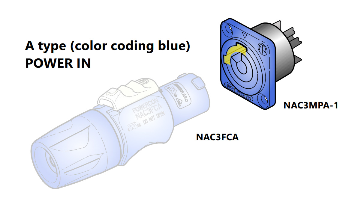 powerCON - роз'єм панельний для підключення мережі живлення, трьохконтактний, 20 A / 250 В, фланець типу "D", колір синій. В упаковці 100 шт.