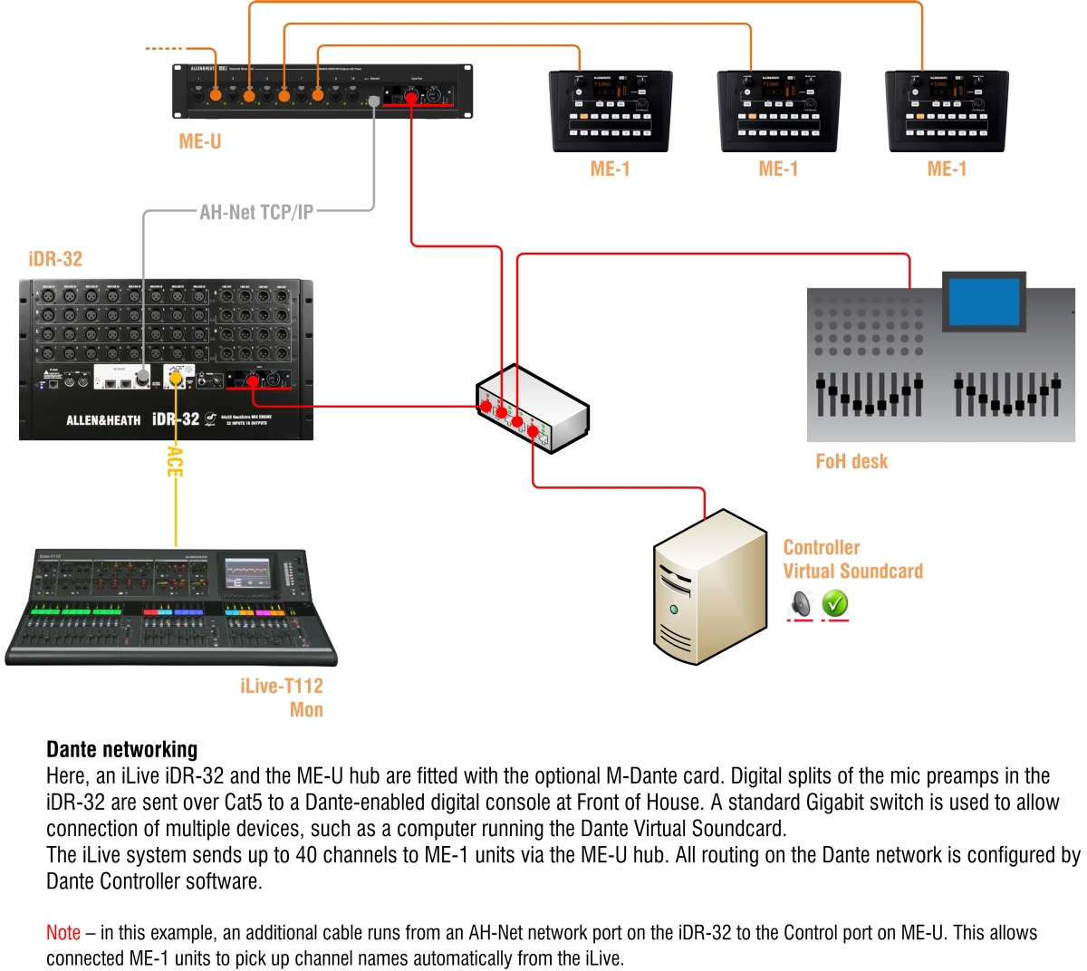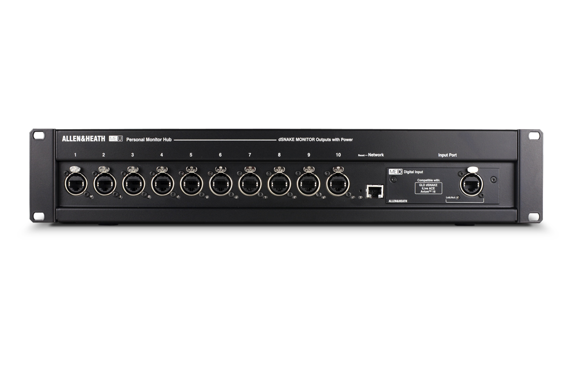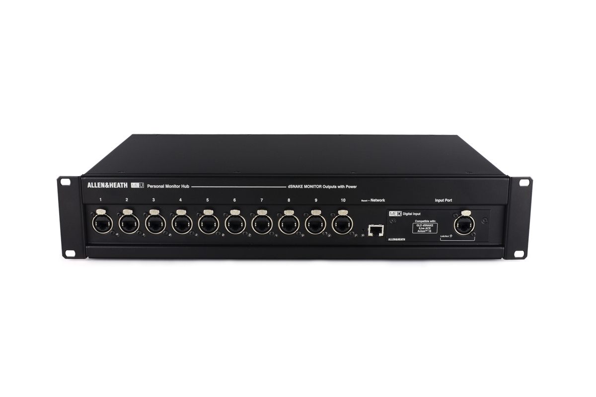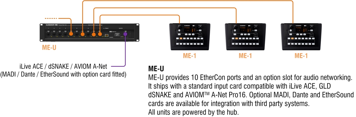 ME-U - це 10-портовий мережевий концентратор турового класу з PoE, що забезпечує живлення та передачу звуку для кількох персональних мікшерів ME-1 та / або ME-500. Картка введення ME-U за замовчуванням дозволяє безперешкодно інтегруватися в мікшерну систему Allen & Heath dLive, Avantis, SQ та Qu. Підключення додаткової плати Dante або MADI до ME-U дозволяє користувачам інших брендів цифрових мікшерних пультів подавати до 40 джерел до ME-1 або до 16 джерел до ME-500.