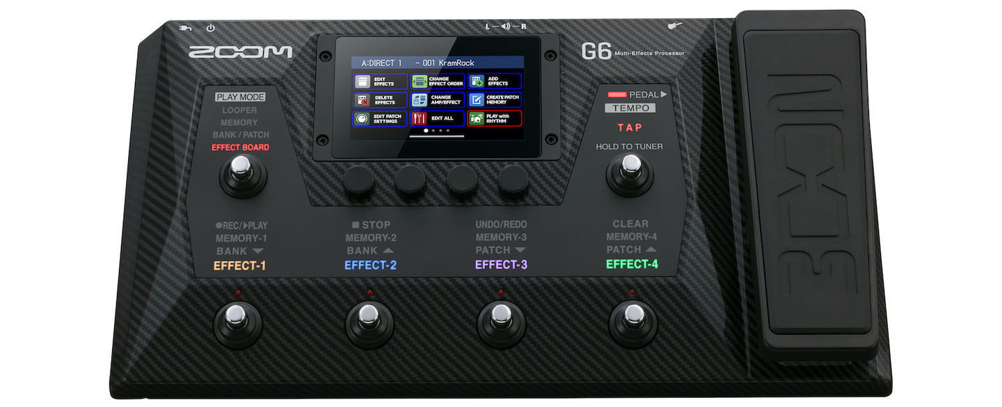 Гітарний процесор Zoom G6 від корпорації Zoom. • вбудований педалборд з панеллю моделювання підсілювачів • кольоровий LCD-дисплей Із сенсорним керування та зрозумілою навігацією • До дев'яти ефектів у ланцюжки, плюс емулятор підсілювача. • Комбінації з орігінальніх моделей підсілювачів. • Орігінальні ЕФЕКТ дисторшн та модуляції. • Можливість завантажити симуляції кабінетів (IR) • Петля send / return ефектів. • Стерео лупер трівалістю 45 секунд. • 68 вбудований ритмічних малюнків. • Режим аудіоінтерфейсу для прямого запису в DAW-програму. • Віддалене Підключення з iOS-прістроїв через застосунок Guitar Lab за допомоги Bluetooth-адаптера BTA-1. • Доступ до бібліотеки Додатковий ефектів через застосунок Zoom Guitar Lab.