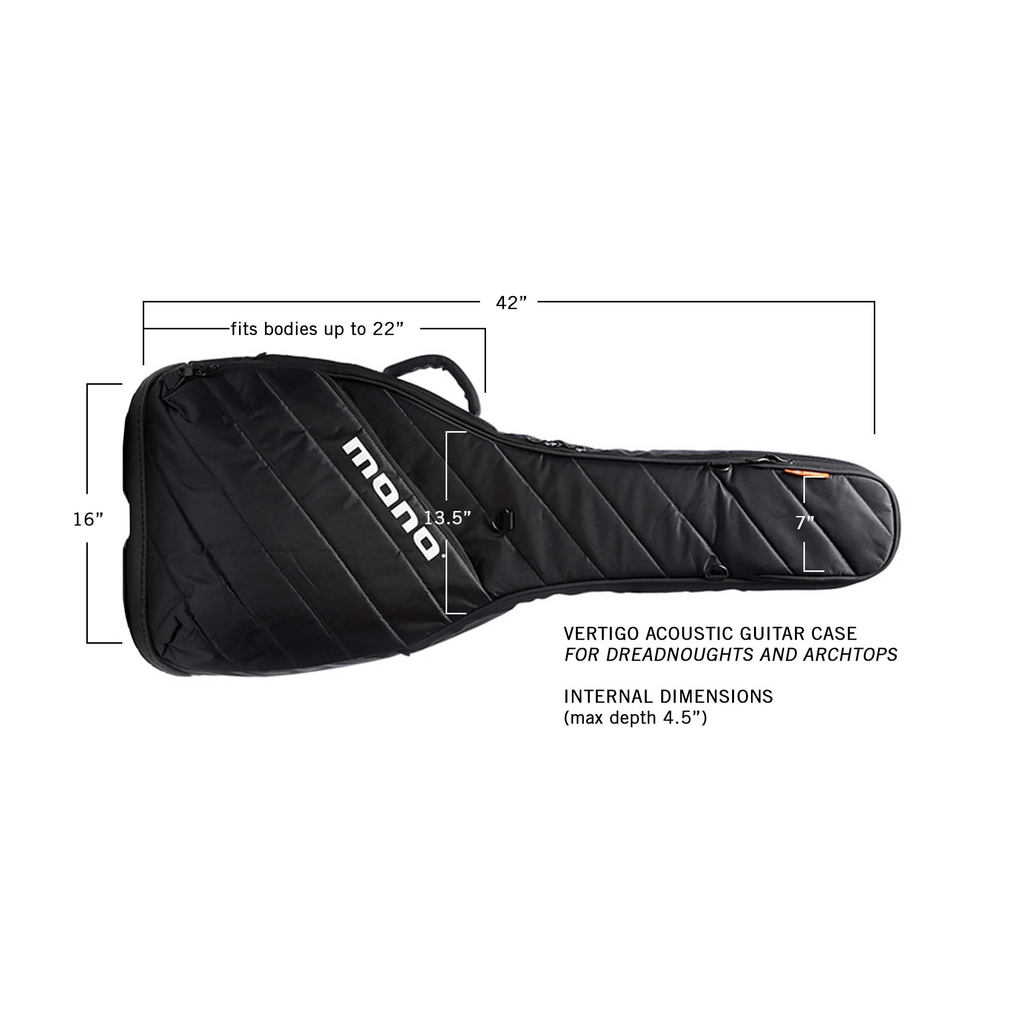 Чохол для акустичної гітари Vertigo Цей футляр призначений для всіх стандартних корпусів акустичних гітар дредноут. Також підходить для більшості арктопів. Внутрішні розміри: 106.7cm x 40.6cm x 11.4cm Зовнішні розміри: 116,8 x 46,5 x 20,8 см Розміри зовнішньої кишені: 22,9 см / 43,2 см x 43,2 см x 3,8 см Вага: 3,3 кг