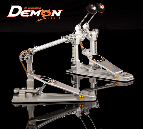 Подвійна педаль Eliminator Demon Drive. Ланцюговий привід, підшипники низького тертя, з'єднувальний механізм z-link, регулювання кулачка тримача калатала, подвійний футборд, замок для збереження натягу пружини, зміна положення футборда по Вистота, фетровий калатало. Кейс в комплекті