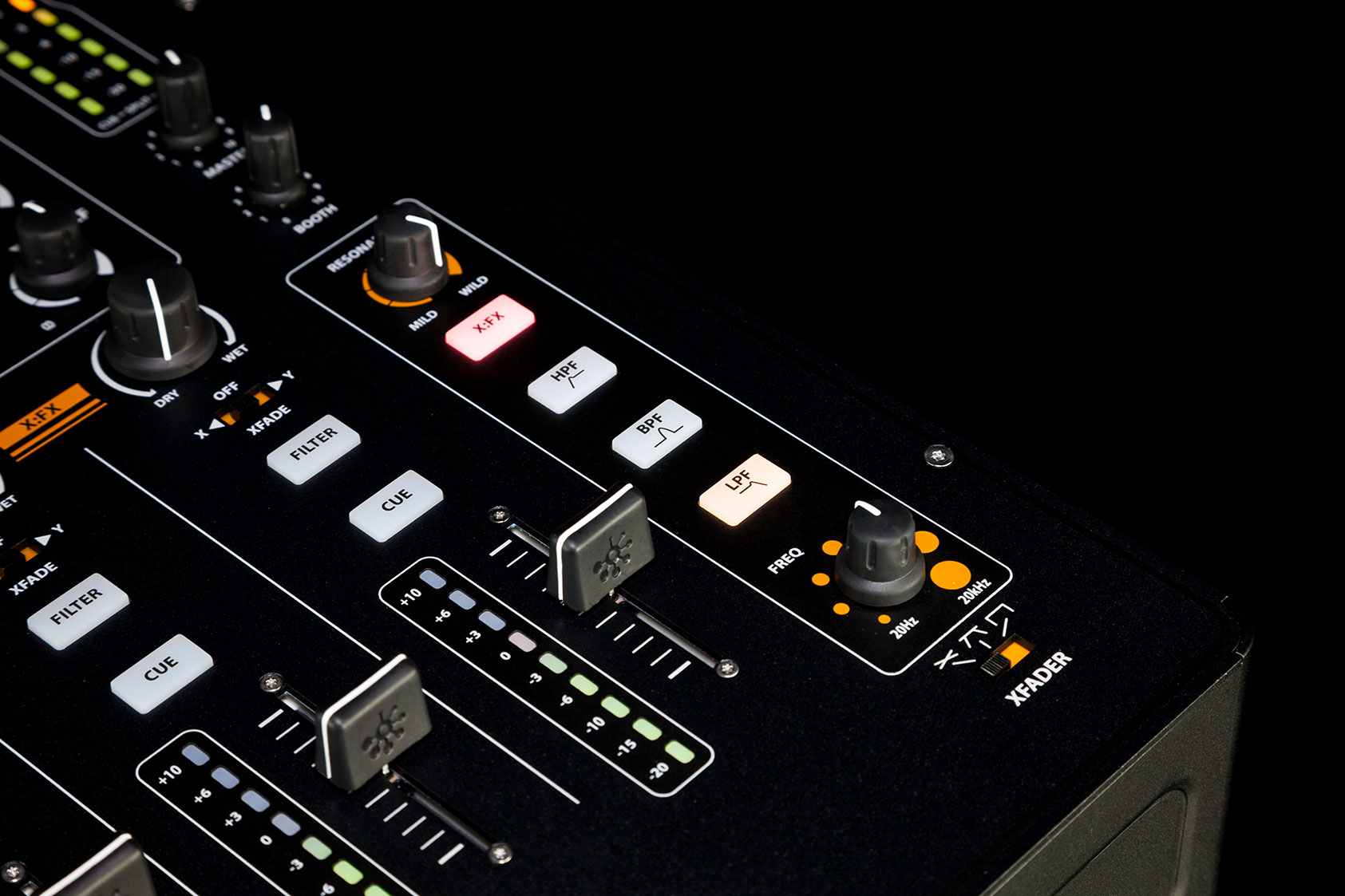 XONE: 43 - аналоговий DJ мікшер оснащений 4-ма стерео каналами і окремим каналом для підключення мікрофона. Основні характеристики: 4 канали з фоно / лінійними входами, Система фільтрів VCF, 3-ех смуговий еквалайзер, петля для зовнішніх ефектів (Посил / Повернення), Мікрофонний вхід з балансні XLR і 2-смуговим еквалайзером, Балансний основний вихід з роз'ємом XLR, Вихід для запису, 2 виходи на навушники (3,5 мм і ¼ дюйма), Плавні канальні фейдери VCA, Змінний кроссфейдер сумісний з Innofader, 9-сегментний індикатор рівня сигналу. Розміри: 320 х 370 х 110 мм; Вага: 5.1 кг.