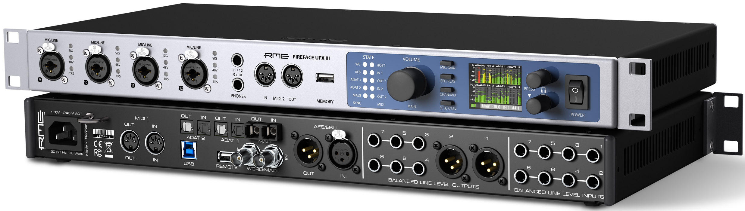 Fireface UFX III може бути серцем будь-якої багатоканальної студії, з легкістю обробляючи до 94 каналів введення-виведення. Безпрецедентна гнучкість, сумісність з різними підключеннями, функція прямого запису на USB-носій DURec та знамените апаратне забезпечення і драйвери RME з низькою затримкою гарантують бездоганну роботу в будь-якому режимі для будь-яких задач звукозапису. 12 аналогових входів / виходів; 4 мікрофонні / інструментальні / лінійні входи на комбо-роз'ємах XLR/TRS; 2 виходи для навушників; 1 вх/вих AES/EBU; 2 вх/вих ADAT; 2 вх/вих SPDIF; 1 вх/вих Word Clock / коаксіальний вх/вих MADI; 1 оптичний вх/вих MADI 2 вх/вих MIDI; Драйвери RME USB 3.0; Сумісність Class Compliant; Потужний DSP-процесор; Цифровий мікшер-маршрутизатор TotalMix FX; Підтримка дистанційного керування за допомогою пульта ARC USB (опціонально); Прямий запис на USB-носій DURec; Автоматичне керування цифровим вхідним підсиленням AutoSet Виходи за схемотехнікою DC-coupled; Технологія високостабільної тактової синхронізації Steady