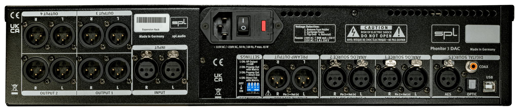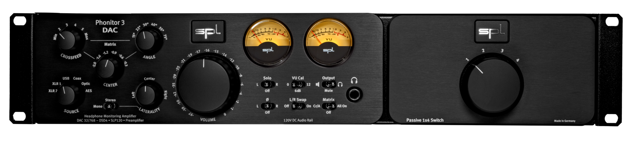 SPL Phonitor 3 + Expansion Rack 103 200 грн. (немає) Підсилювач для навушників та контролер моніторингу з технологією 120 В + Expansion Rack. За допомогою стійки розширення настільний пристрій, такий як Phonitor 3, можна встановити в 19-дюймову стійку. Розширювальна стійка оснащена поворотним перемикачем, який пасивно спрямовує вихідний стереосигнал вбудованого пристрою на чотири стереовиходи. Перемикання відбувається пасивно, тобто без активної електроніки в сигнальному тракті та без джерела живлення. Phonitor 3, Phonitor 3 DAC або SMC 7.1 розширюються трьома додатковими стереовиходами разом з розширювальною стійкою, щоб можна було підключити, наприклад, повнодіапазонні, середньопольні та ближньопольні монітори.Він пропонує таку ж якість моніторингу, як і великі мастерингові консолі SPL — як на динаміках, так і на навушниках.