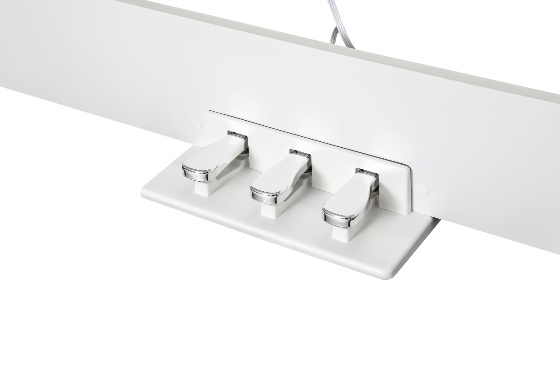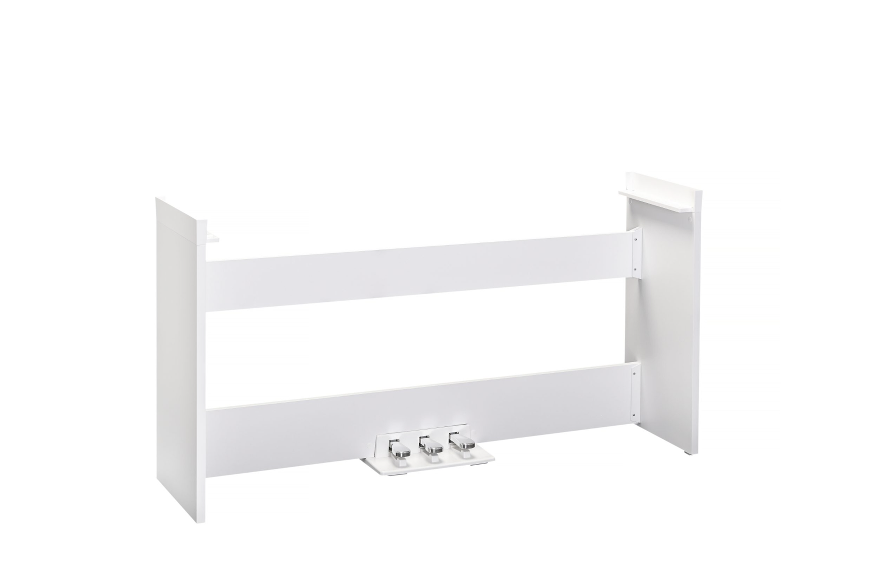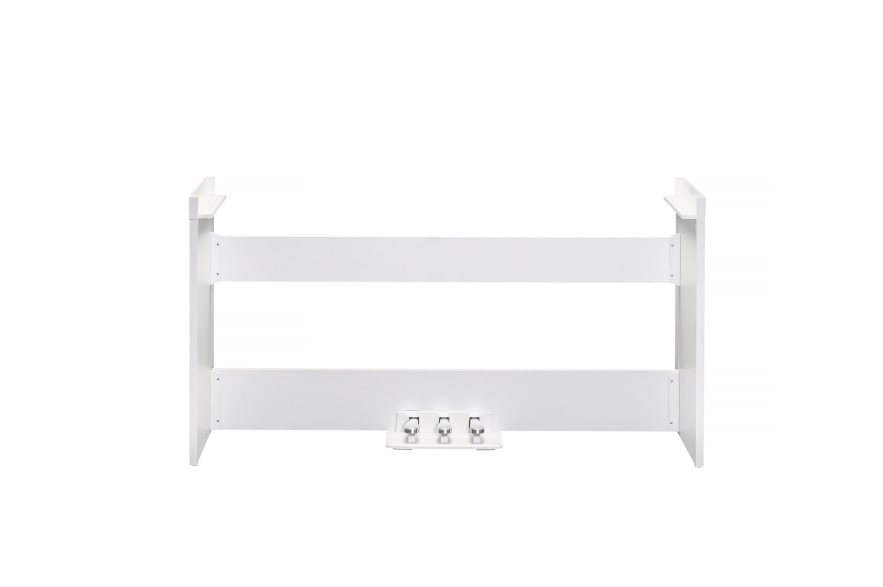 Стійка для портативного цифрового піаніно KA-E1, що оснащена потрійним блоком з класичними рояльними педалями (сустейн, состенуто, софт). Розміри: 131,5(ширина) х 68,5(висота) х 33(глибина), вага: 11 Кг. Колір білий.